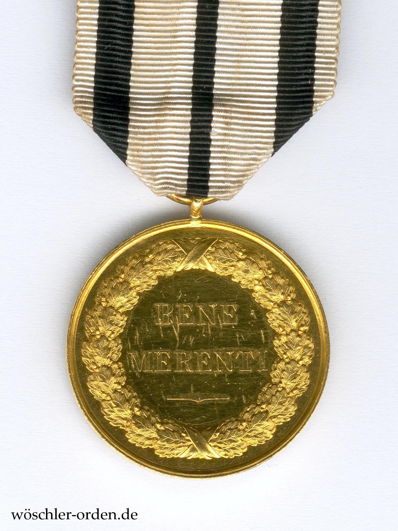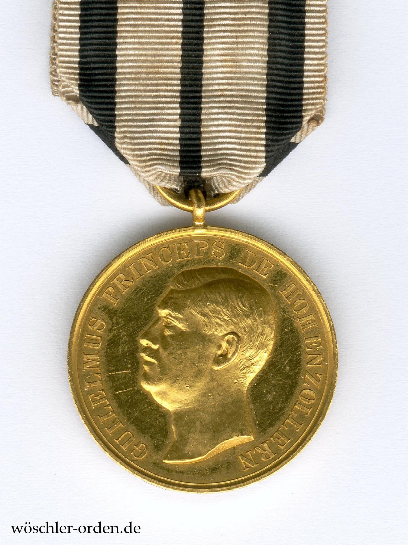 Gold geprägt, an Ringöse mit Bandring. Vorderseitig das Portrait des Fürsten nach links mit schwacher Signatur „O. Schultz 07.“ am Halsabschnitt, darum latinisierte Umschrift „GUILELMUS PRINCEPS DE HOHENZOLLERN“. Rückseitig oben und unten gebundener Eichenlaubkranz mit zweizeiliger Inschrift „BENE / MERENTI“, darunter waagrechter Zierstrich.