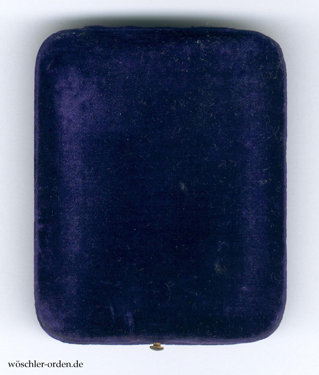 Dazu das schmucklose Verleihungsetui in violettem Samt, innen mit samtener Einlage. Der Deckel in Seide, mit goldgeprägtem Wappen und dreizeiliger Herstellerangabe „J. G. ZIMMERER & SOHN / HOFJUWELIERE / SIGMARINGEN“.