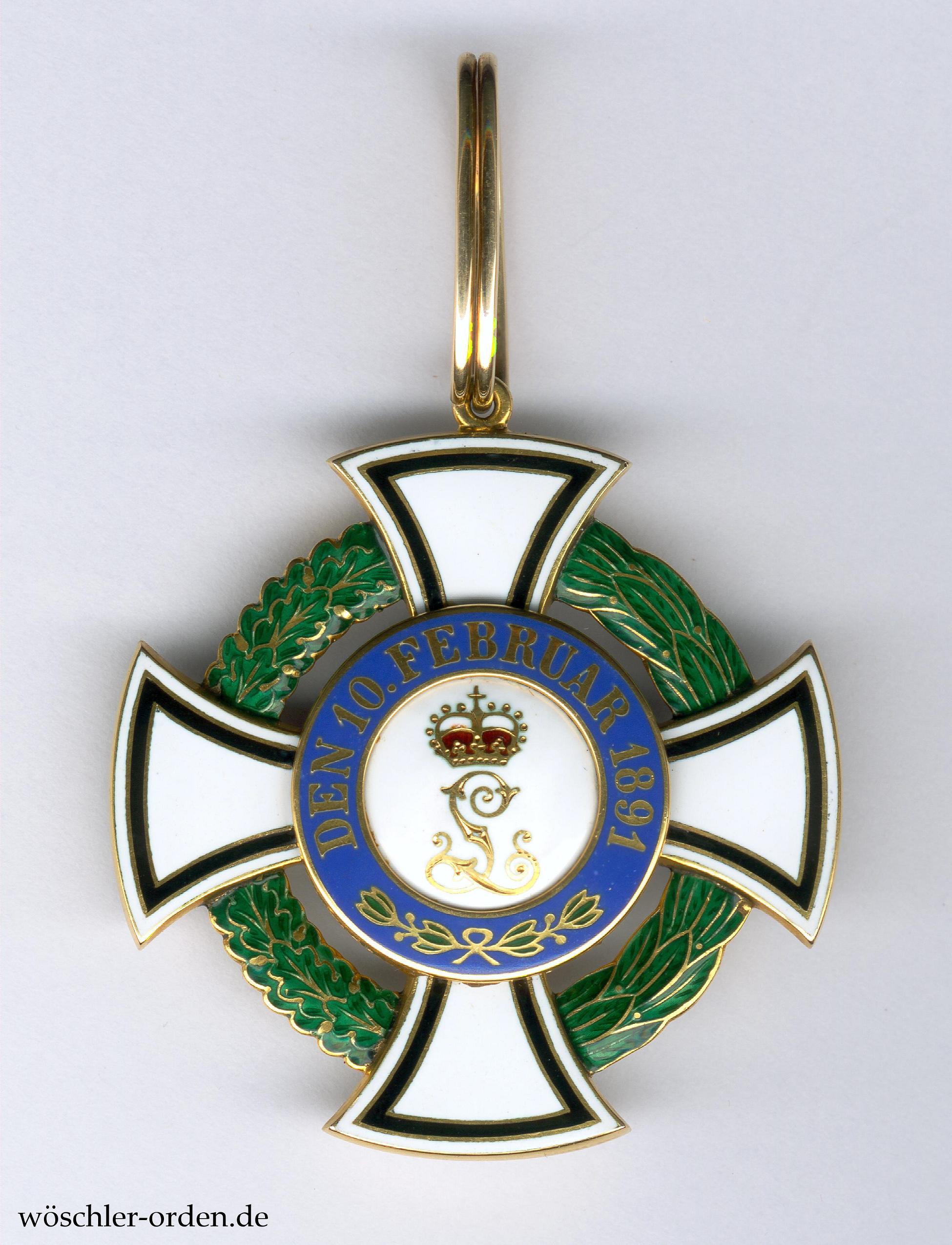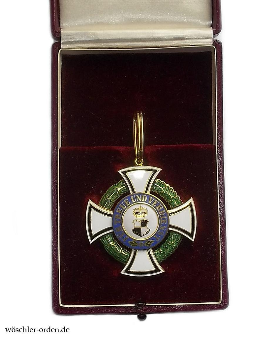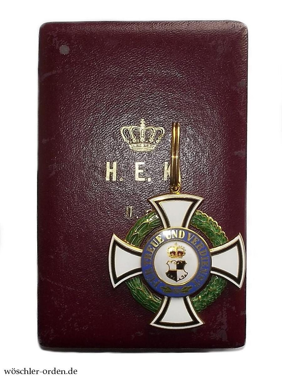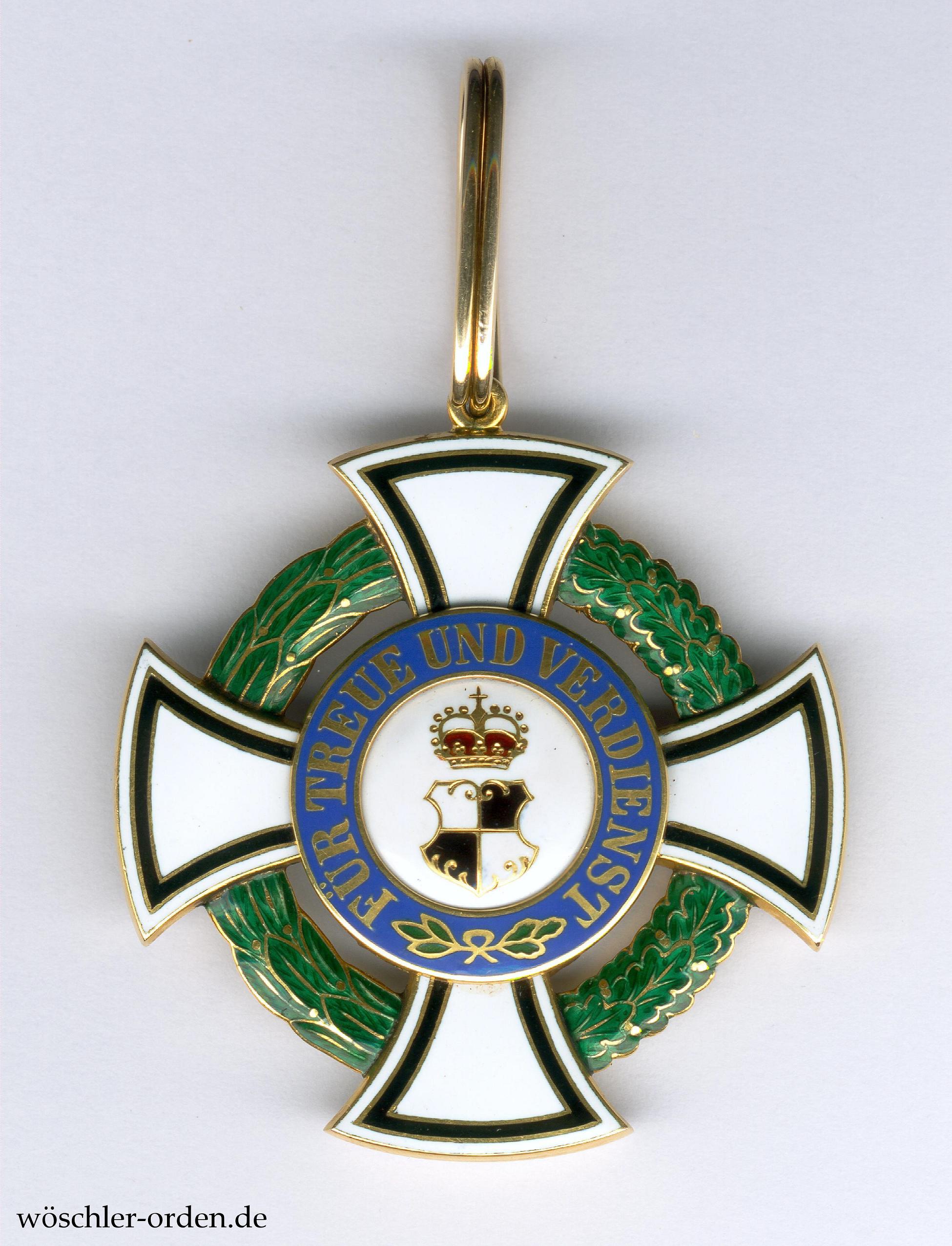 Frühes Exemplar der zweiten, größeren Ausgabe. Gold und Emaille, mehrteilig gefertigt, der Eichenlaub- und Lorbeerkranz zwischen den Kreuzarmen flinkiert und transluzid emailliert, Wappen und Monogramm der Medaillons feinst nachgraviert. Ohne Herstellerpunzen, jedoch mutmaßlich Fertigung der Firma C. F. Zimmermann, Pforzheim, im Auftrag der Hofjuweliere J. G. Zimmerer & Sohn, Sigmaringen, wohl aus der Zeit kurz vor dem Weltkrieg.