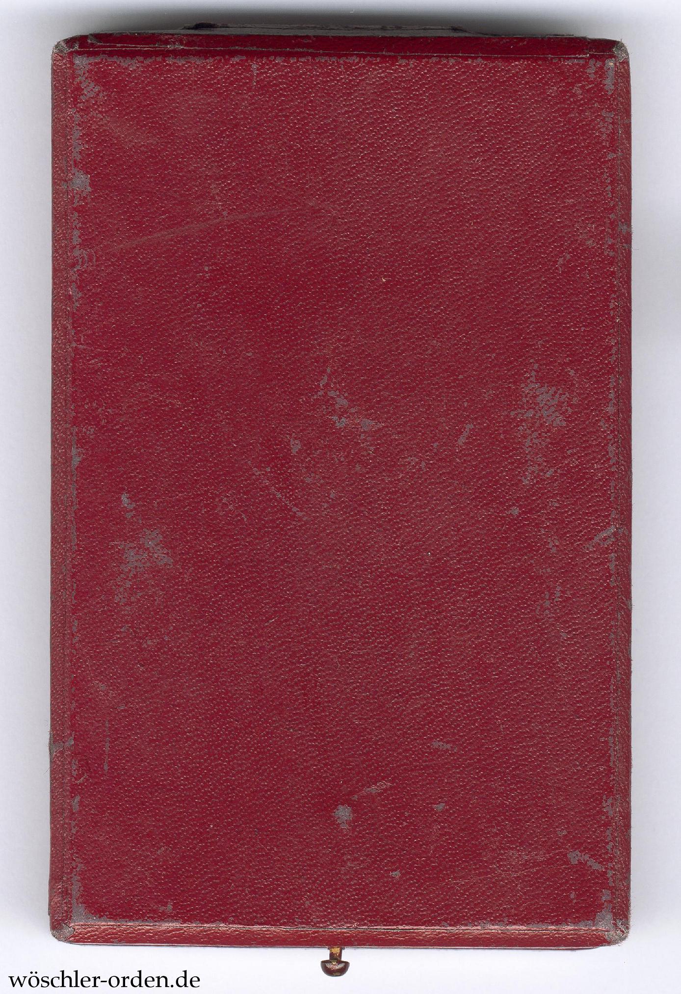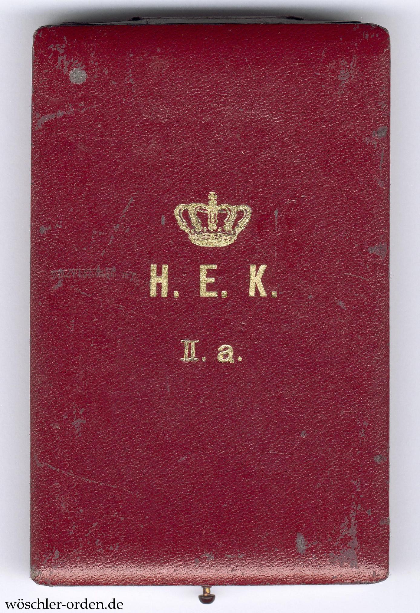 Dazu das weinrote, mit Papier bezogene Verleihungsetui, der Deckel mit zweizeilig aufgedruckter Klassenangabe „H. E. K. / II. a.“ unter Krone. Innen mit weinroter Samteinlage mit Aussparungen für das Kreuz und das Band, der Deckel in weißer Seide verkleidet. Ebenfalls ohne eine Hersteller- oder Lieferantenangabe.