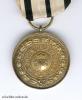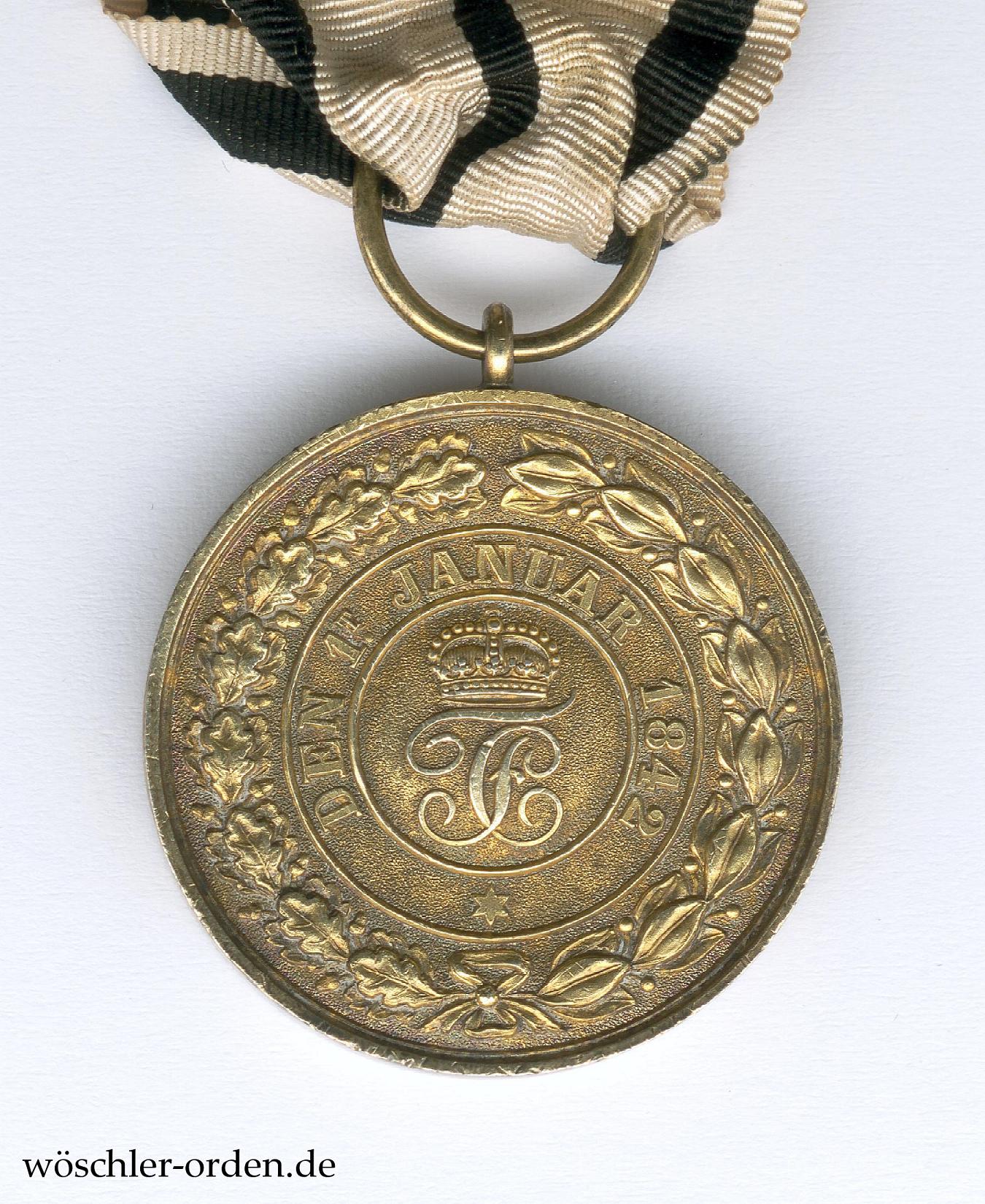 Exemplar aus der Zeit des dritten und endgültigen, ab 1852 verliehenen Modells, in der zweiten Ausgabe mit dem unrichtigen Stiftungsdatum „1T. JANUAR 1842“. Silber geprägt und vergoldet, an einfacher Ringöse mit Bandring.