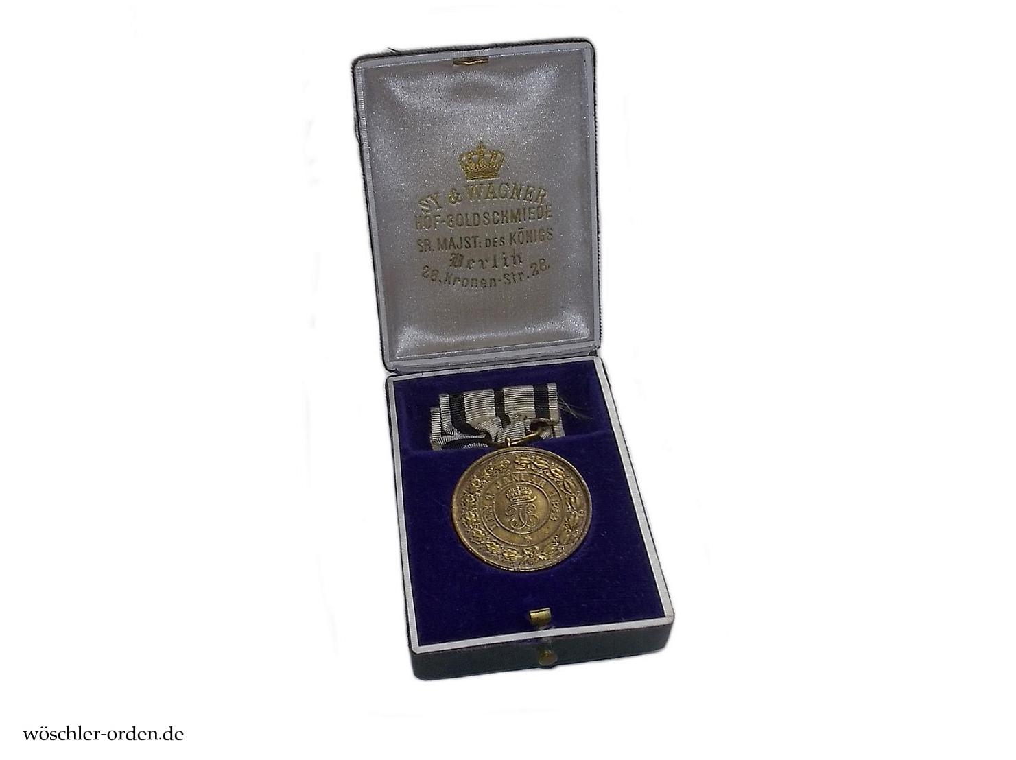 Dazu das schwarze, lederbezogene, schmucklose Verleihungsetui, der Deckel innen in weißer Seide und goldgeprägter, fünfzeiliger Herstellerangabe „SY & WAGNER / HOF-GOLDSCHMIEDE / SR. MAJST: DES KÖNIGS / Berlin / 28. Kronen-Str. 28.“ unter der preußischen Königskrone, die Einlage in violettem Samt.