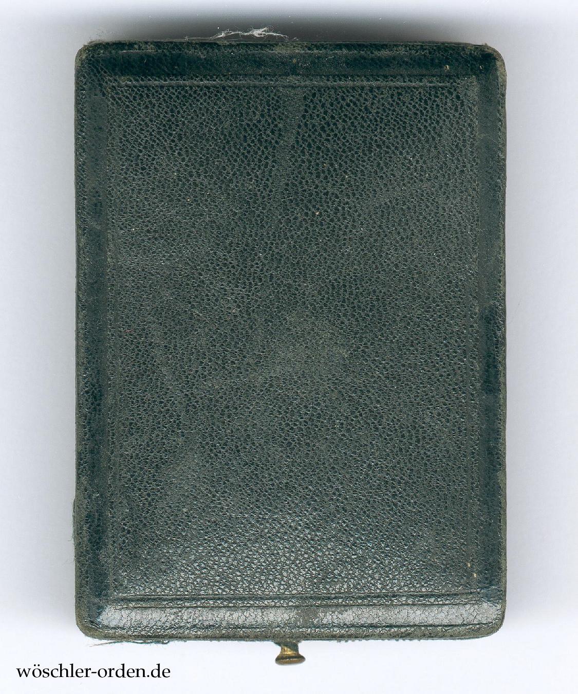 Die Medaille in ordentlicher, etwas getragener Erhaltung, mit tragebedingten kleinen Randfehlern. An etwa 12 cm langem Band. Das Etui in ordentlicher Erhaltung, mit leichten Alters- und Gebrauchsspuren.
