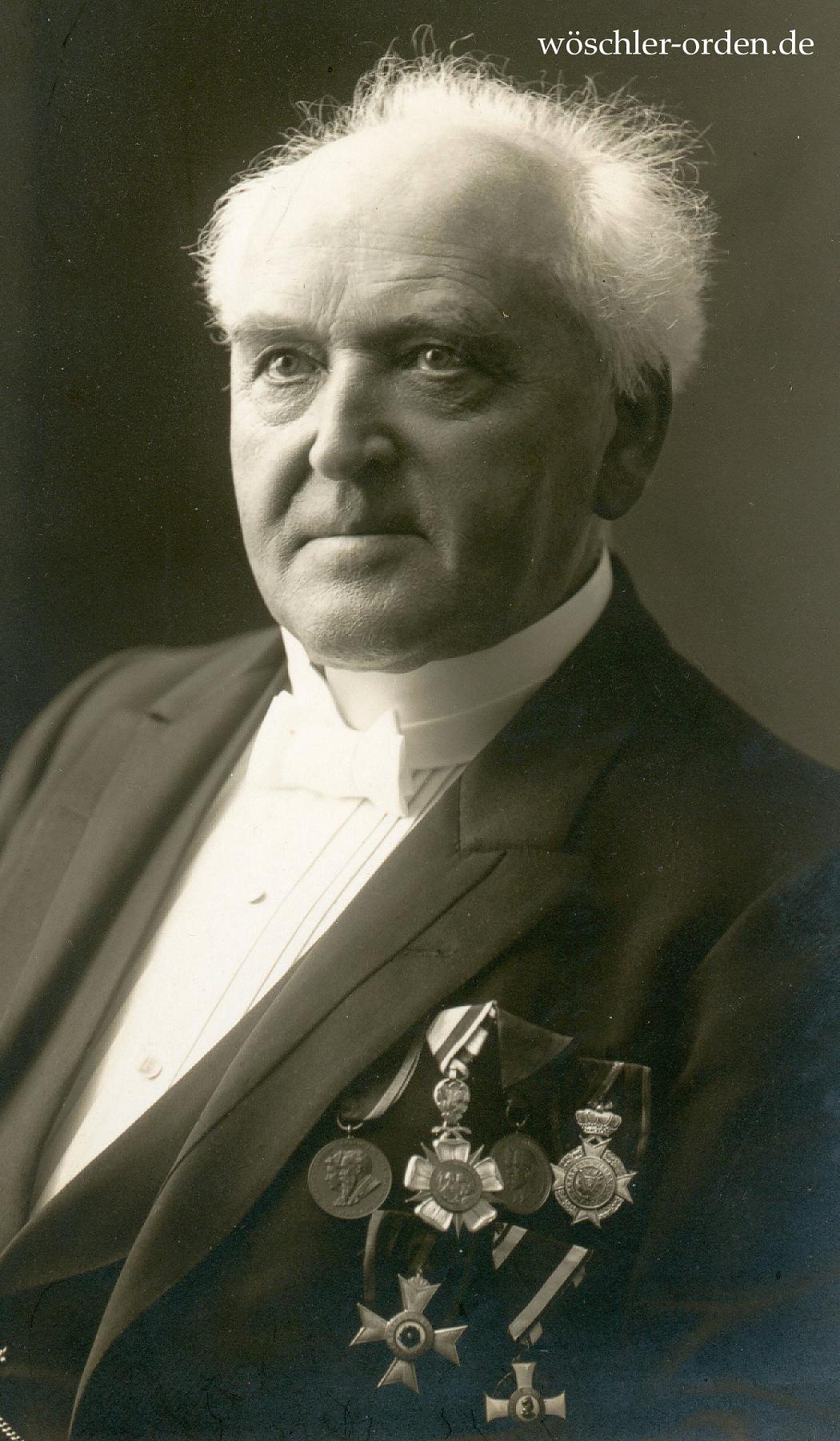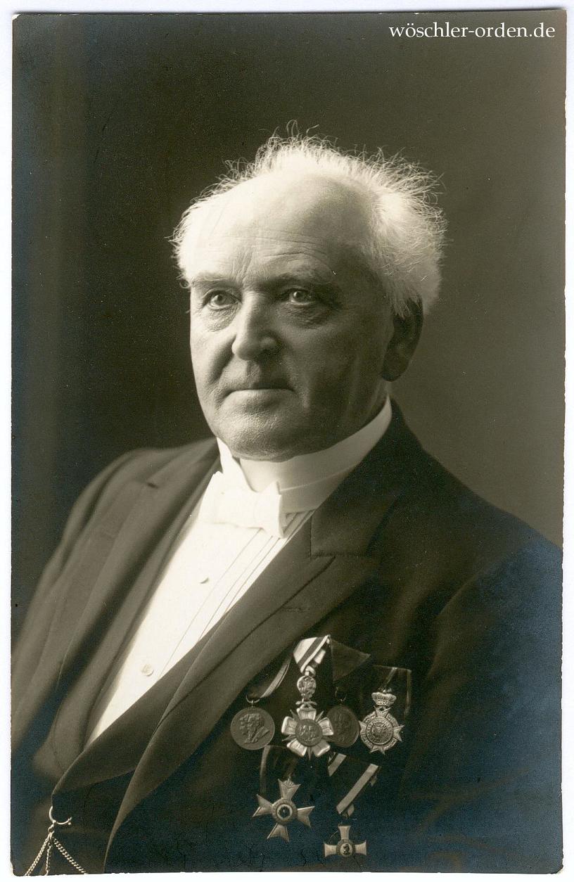 Fürstentum Lippe, Portraitphoto des Geheimen Intendanzrats am Landestheater Detmold Albert Berthold im Frack. Er trägt an der Brust, jeweils einzeln, teils als 1er Ordensschnalle, teils an Dreiecksbändern konfektioniert, folgende Auszeichnungen: