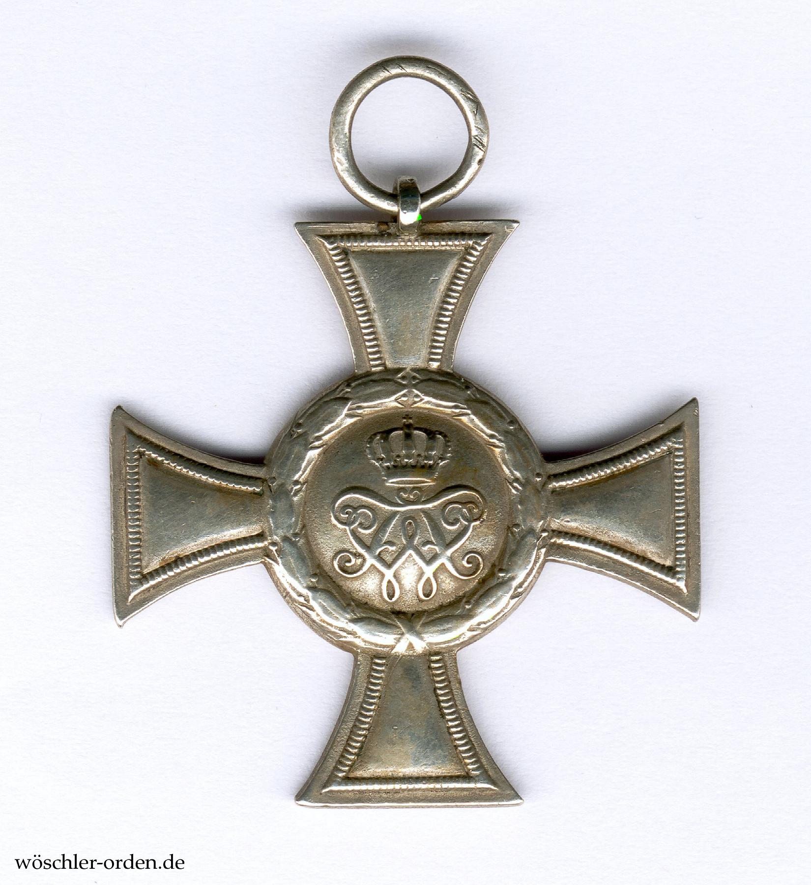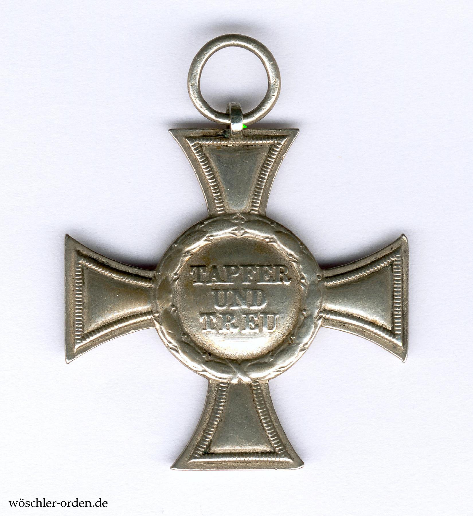 Ausgabe mit Inschrift „TAPFER / UND / TREU“ im Medaillon der Vorderseite. Silberguss, an angelöteter, stabiler Ringöse mit geschlossenem Bandring. Ohne Herstellermarkierung. Bei den gegossenen Exemplaren handelt es sich um die früheren, wie sie hauptsächlich für den Krieg von 1870/71 verliehen wurden.