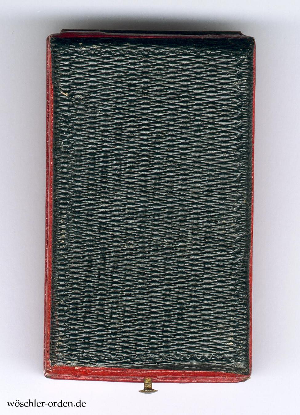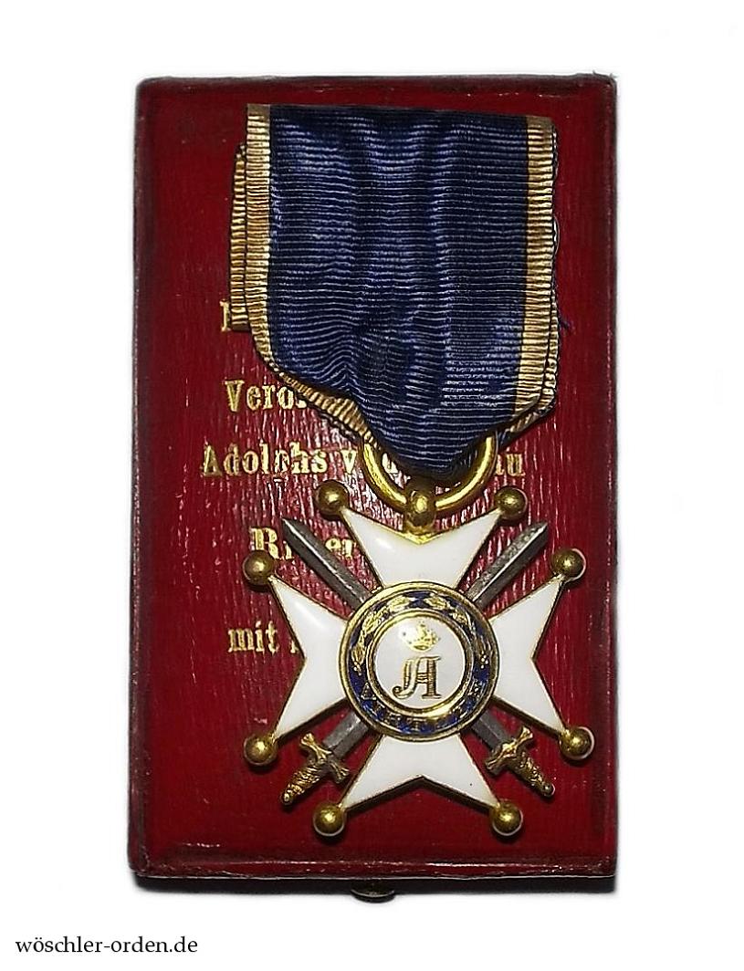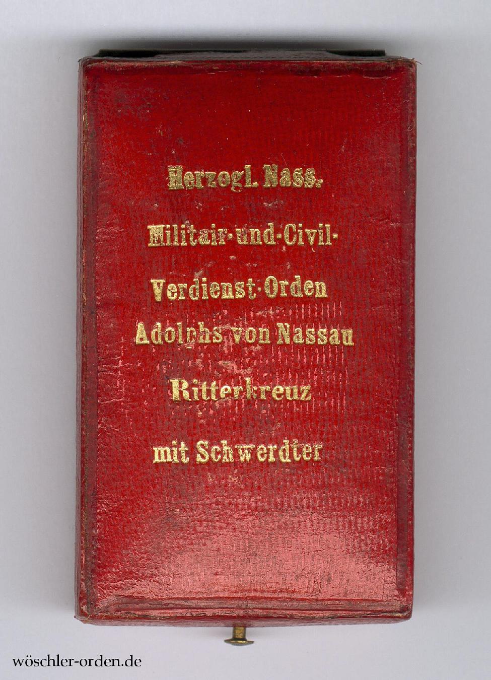 Dazu das rote Verleihungsetui, innen mit schwarzer Samteinlage mit Aussparungen für das Kreuz und das Band sowie altweiß-seidener Verkleidung des Himmels, in der selteneren, beschrifteten Ausführung mit goldgeprägter, sechszeiliger Inschrift „Herzogl. Nass. / Militair-und-Civil- / Verdienst-Orden / Adolphs von Nassau / Ritterkreuz / mit Schwerdter“ auf dem Deckel.