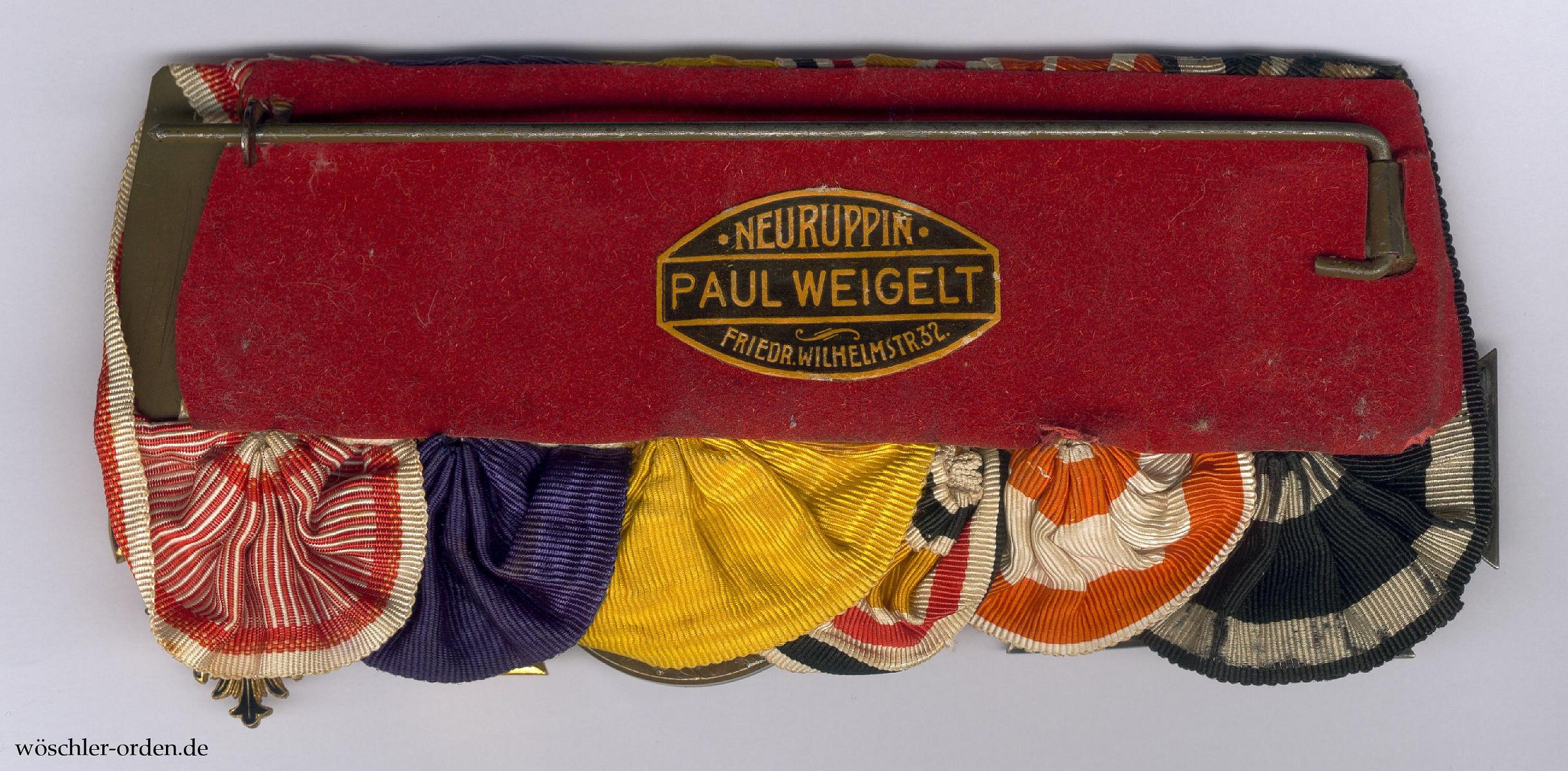 Die Auszeichnungen durchwegs verliehene Originale, der Roter-Adler-Orden aus Fertigung der Hofjuweliere Johann Wagner & Sohn, Berlin, mit entsprechender Ritzmarke „W“ am unteren Kreuzarm, der Franz-Joseph-Orden in der ab etwa Frühjahr 1916 gefertigten Ausgabe aus vergoldeter Bronze, der Bandring mit Herstellerpunzierung „V. MAYERS SÖHNE / IN WIEN“ sowie der für die „unechten“ Stücke obligatorischen „Sterchenpunze“. Die Schnalle mit sauber bogenförmig konfektionierten Bändern, rückseitig stabile Tragenadel und rote Stoffabdeckung, diese mit aufgeklebtem Papieretikett von Paul Weigelt, Neuruppin.