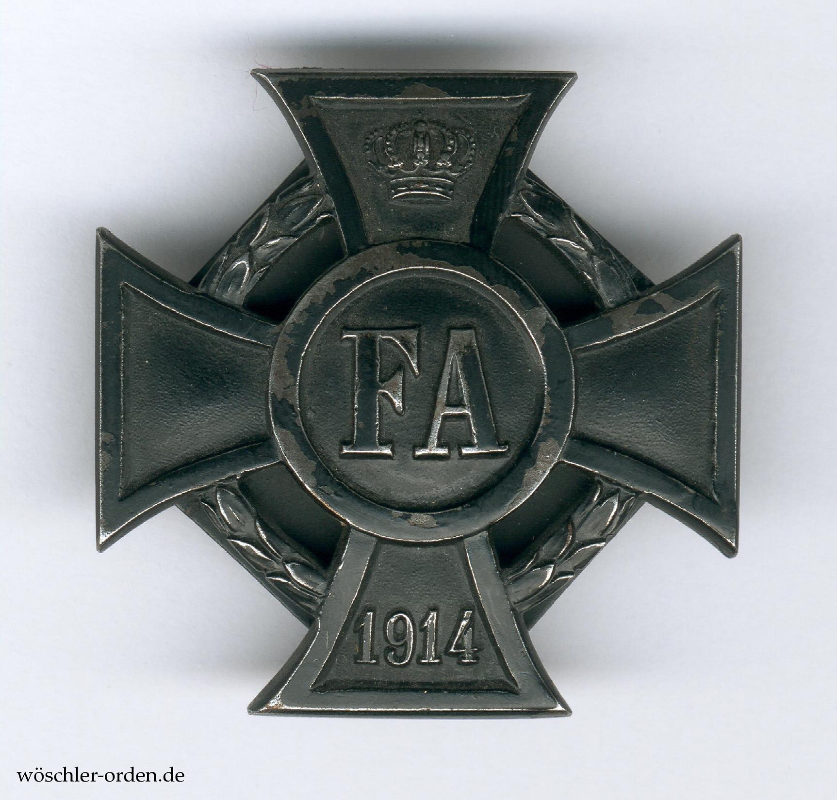 Das Friedrich-August-Kreuz wurde am 24. September 1914 von Großherzog Friedrich August für Offiziere, Unteroffiziere und Mannschaften sowie sonstige Personen des Großherzogtums und solche, die zu dem Stifter und seinem Lande in näherer Beziehung standen, als Kriegsauszeichnung in zwei Klassen gestiftet, wobei die II. Klasse auch an Daheimgebliebene – dann an einem Band in „verkehrten“ Farben – verliehen werden konnte. Der Entwurf des Kreuzes stammte vom Flügeladjutanten des Großherzog, Oberst von Jordan. Nach Beyreiß erfolgten bis Ende 1916 nur 1734 Verleihungen der I. Klasse, bis Ende 1918 wurden insgesamt 6900 Stück an die Ordenskanzlei geliefert. Dies dürfte als näherungsweise Gesamtverleihungszahl anzunehmen sein.