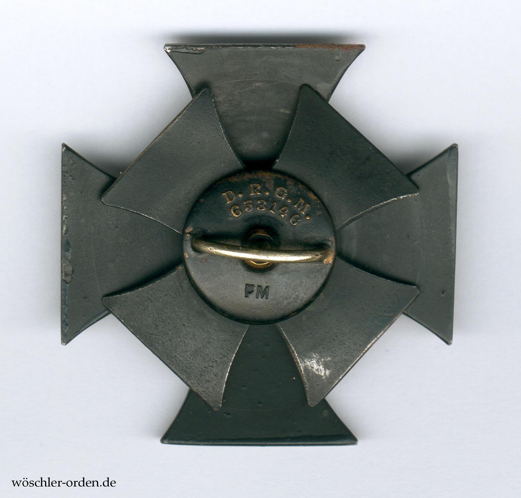 Zweitstück, Eisen schwarz lackiert, an Schraube, mit stählernem Gegenkreuz und buntmetallener Schraubscheibe, diese mit Musterschutz-Bezeichnung „D.R.G.M. / 653146“ und Herstellerpunze „PM“ der Firma Paul Meybauer, Berlin.