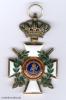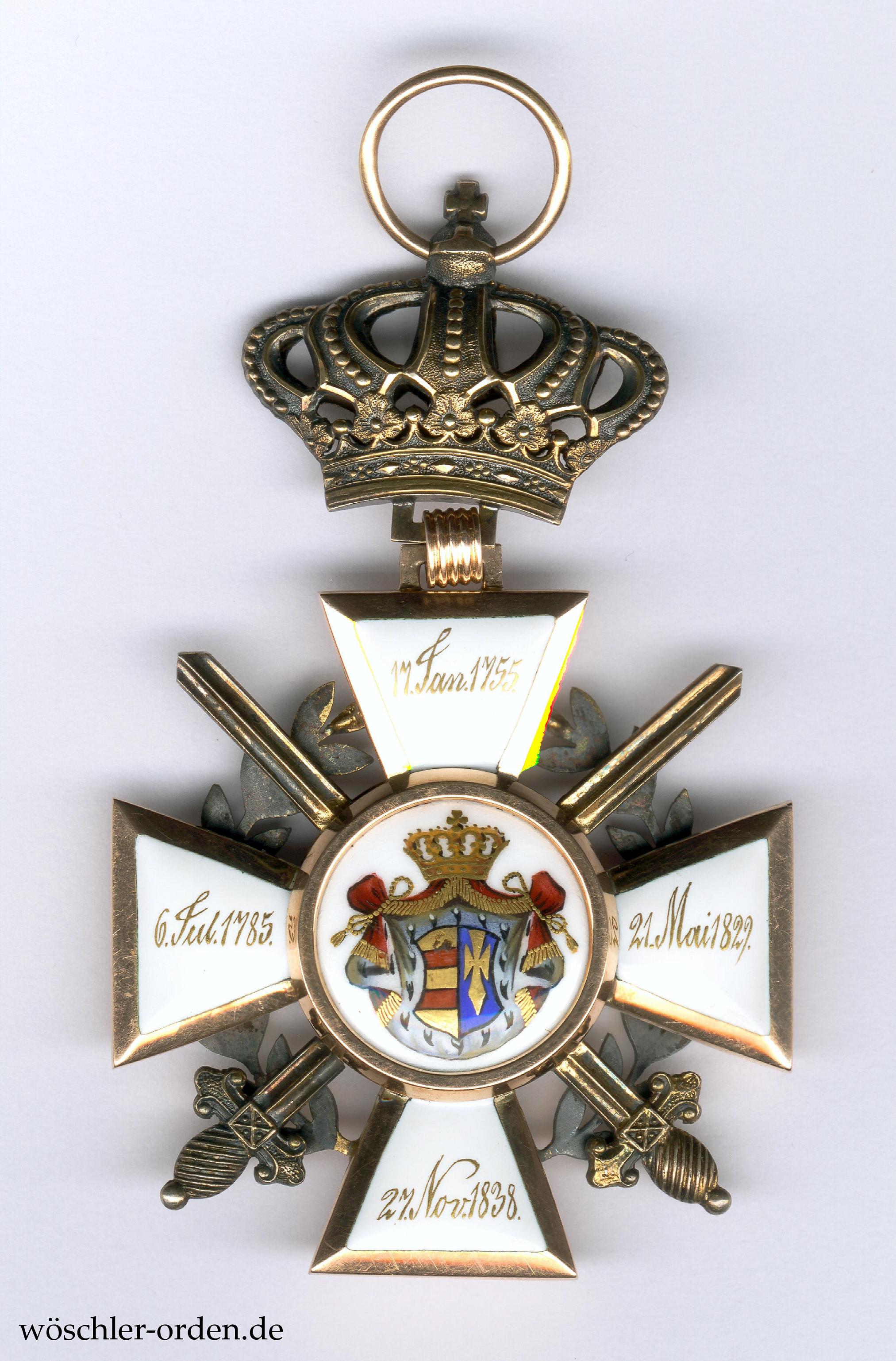 Das Ordenskreuz in etwas früherer, echt goldener Fertigung wohl durch die Firma C. F. Zimmermann, Pforzheim, für den Hofjuwelier Bernhard Knauer, Oldenburg, in teils rötlichem, teils gelblichem Gold, das Medaillon der Vorderseite flinkiert und transluzid blau und rot emailliert, die Kreuzarme und das Rückseitenmedaillon opak weiß emailliert, letzteres, ebenso wie die Kreuzarmflächen revers, feinst bemalt. Bedarfsgemäß wurde das Kreuz während des Weltkrieges durch den Hofjuwelier Knauer mit vergoldeten Schwertern und ebenfalls vergoldeten sowie transluzid grün emaillierten Lorbeerzweigen versehen.