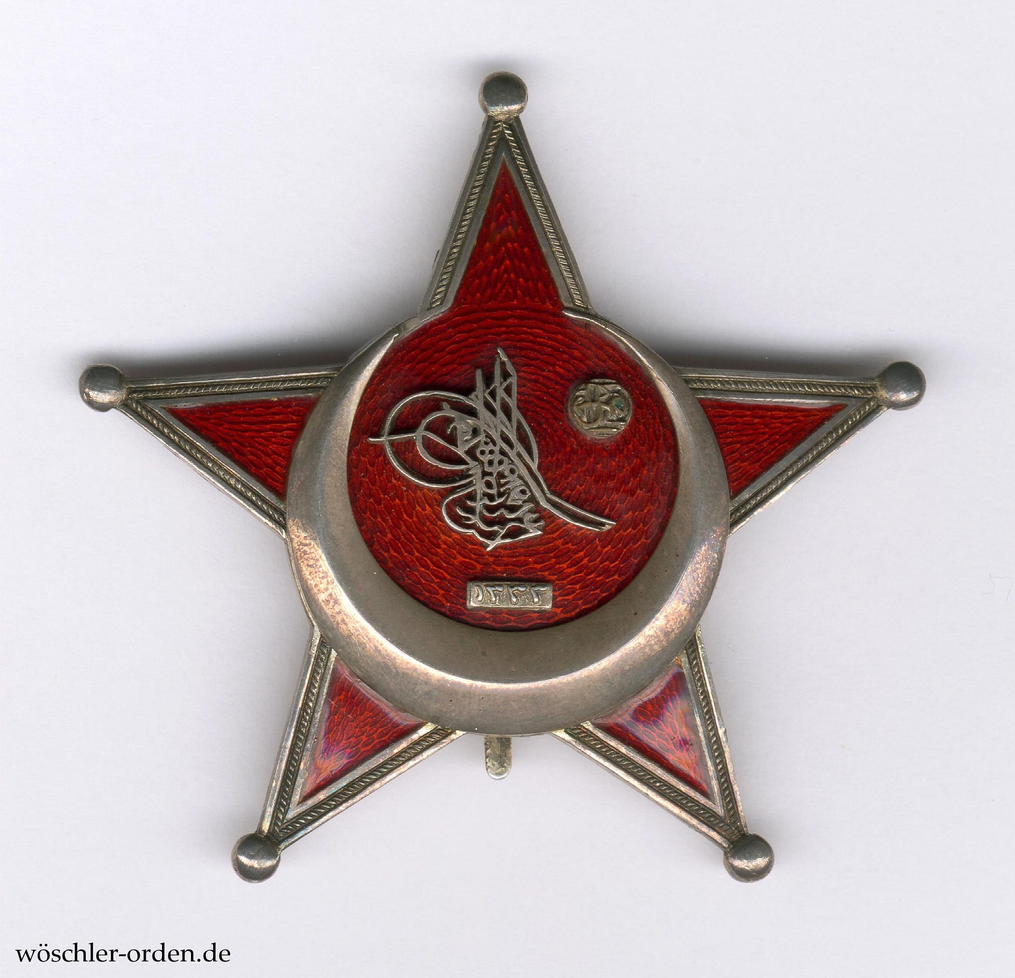 Wohl zeitgenössische, sehr hochwertige und sicherlich deutsche Zweitfertigung mutmaßlich der Firma C. F. Zimmermann, Pforzheim. Silber, der Halbmond separat gefertigt und aufgelötet, Tughra, „Al Ghazi“ und Jahreszahl jeweils zweifach fein vernietet, erstere sauber ausgesägt. Rückseitig vertikal angebrachtes hochwertiges Nadelsystem, die Tragenadel mit Lieferantenpunzierung „FRIEDR.SEDLATZEK BERLIN“ der Firma Friedrich Sedlatzek sowie Punzierung „900“ für den Feingehalt.