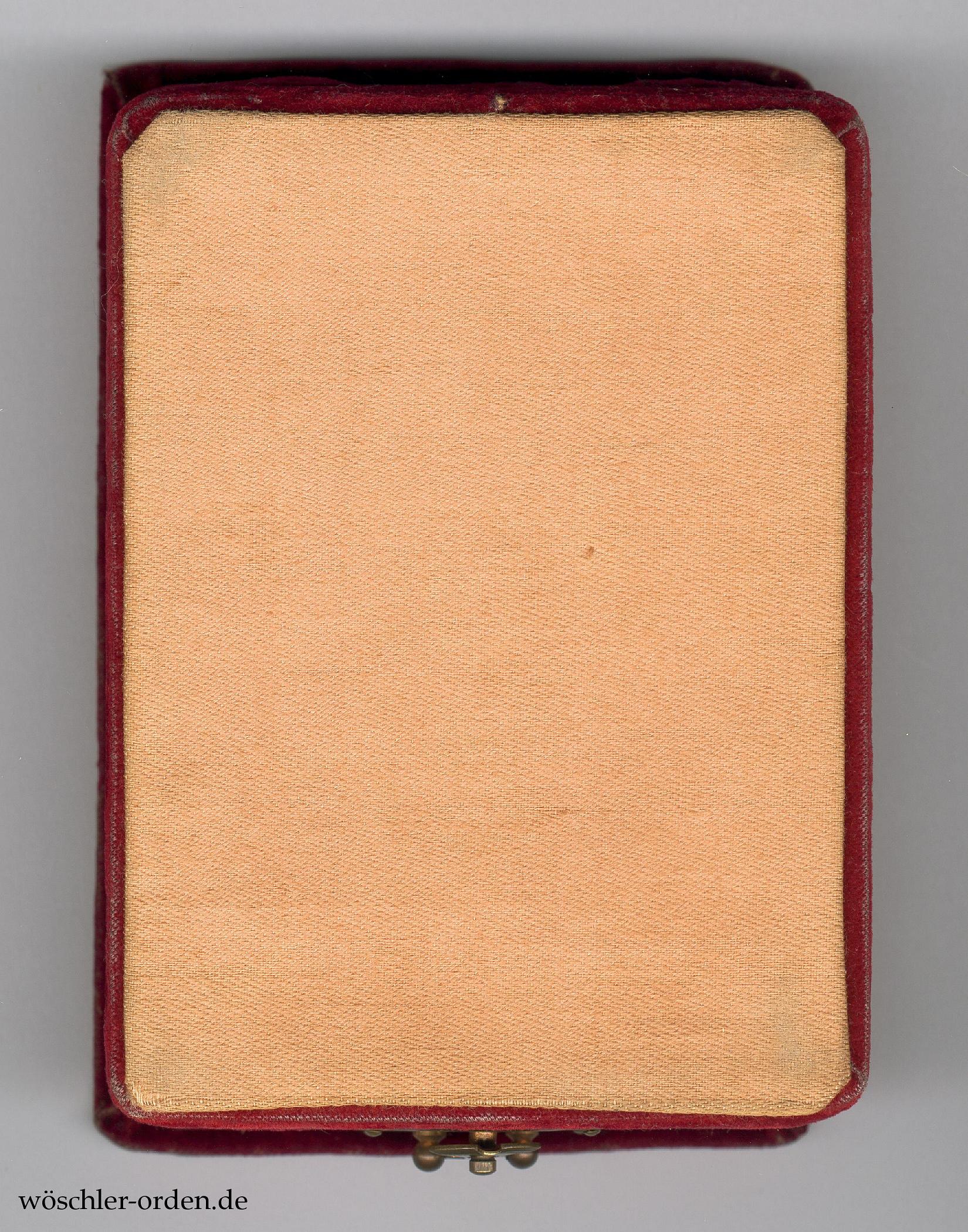 Dazu das mit 12,5 cm x 9 cm x 3 cm recht großformatige, prächtige Verleihungsetui in weinrotem Samt mit goldgeprägter Tughra und Klassenangabe auf dem Deckel, innen in schwarzem Samt und weißer Seide verkleidet.