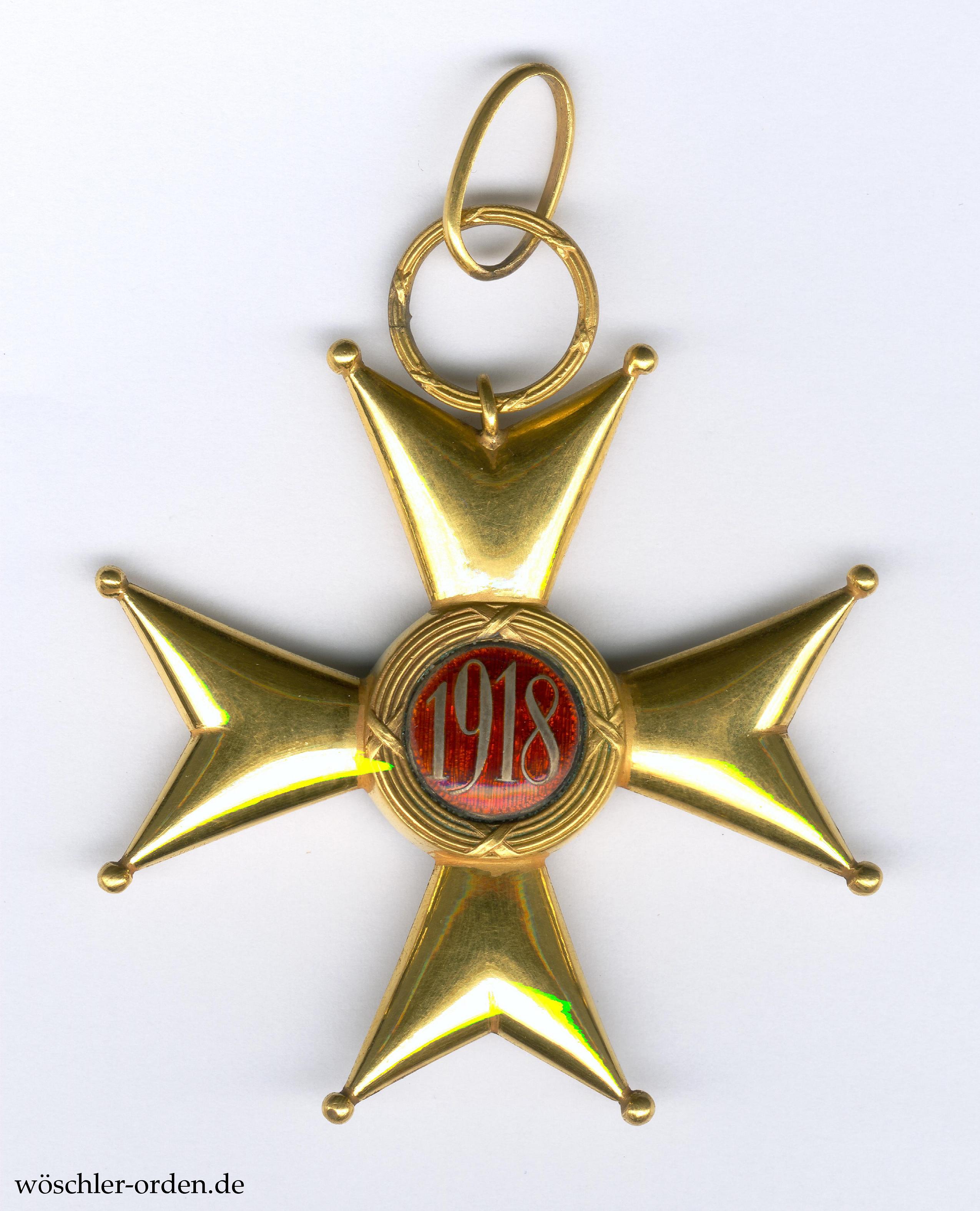 Exemplar des ersten, bis 1939 bzw. 1945 verliehenen Modells mit Jahreszahl „1918“ im rückseitigen Medaillon. Bronze, mehrteilig gefertigt, vergoldet und mehrfarbig, teils transluzid emailliert.