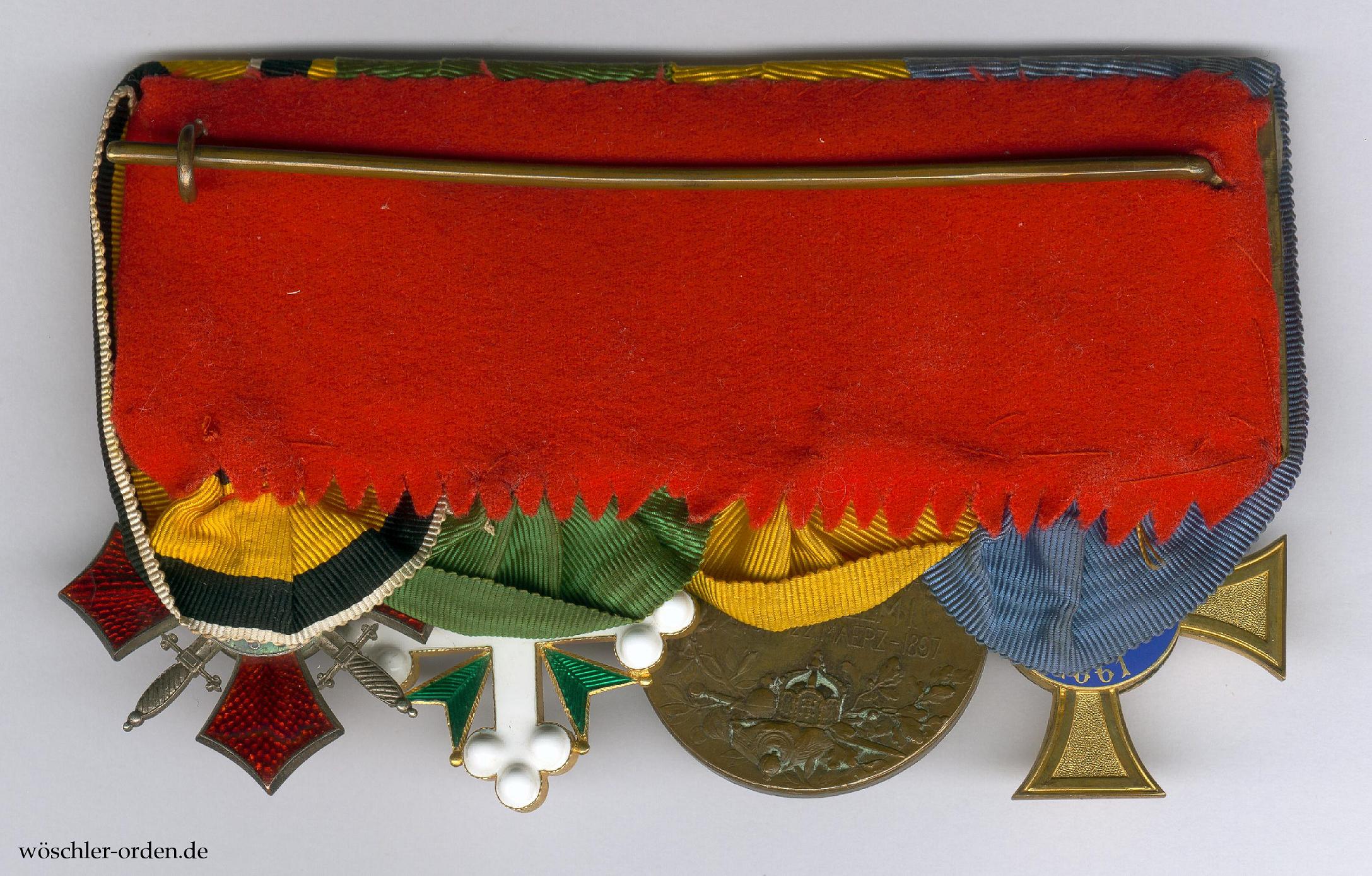 Die Auszeichnung allesamt verliehene Originale, der Königliche Kronenorden mit Ritzmarke „N“ der Gold- und Silberwarenhandlung C. E. Neuhaus & Sohn, Berlin, am unteren Kreuzarm, der Mauritius-und-Lazarus-Orden mit unaufgelöster Herstellerpunzierung „D F“ (?) ebenda. Die Schnelle mit sauber bogenförmig konfektionierten Bändern, rückseitig Tragenadel und rote Stoffabdeckung.