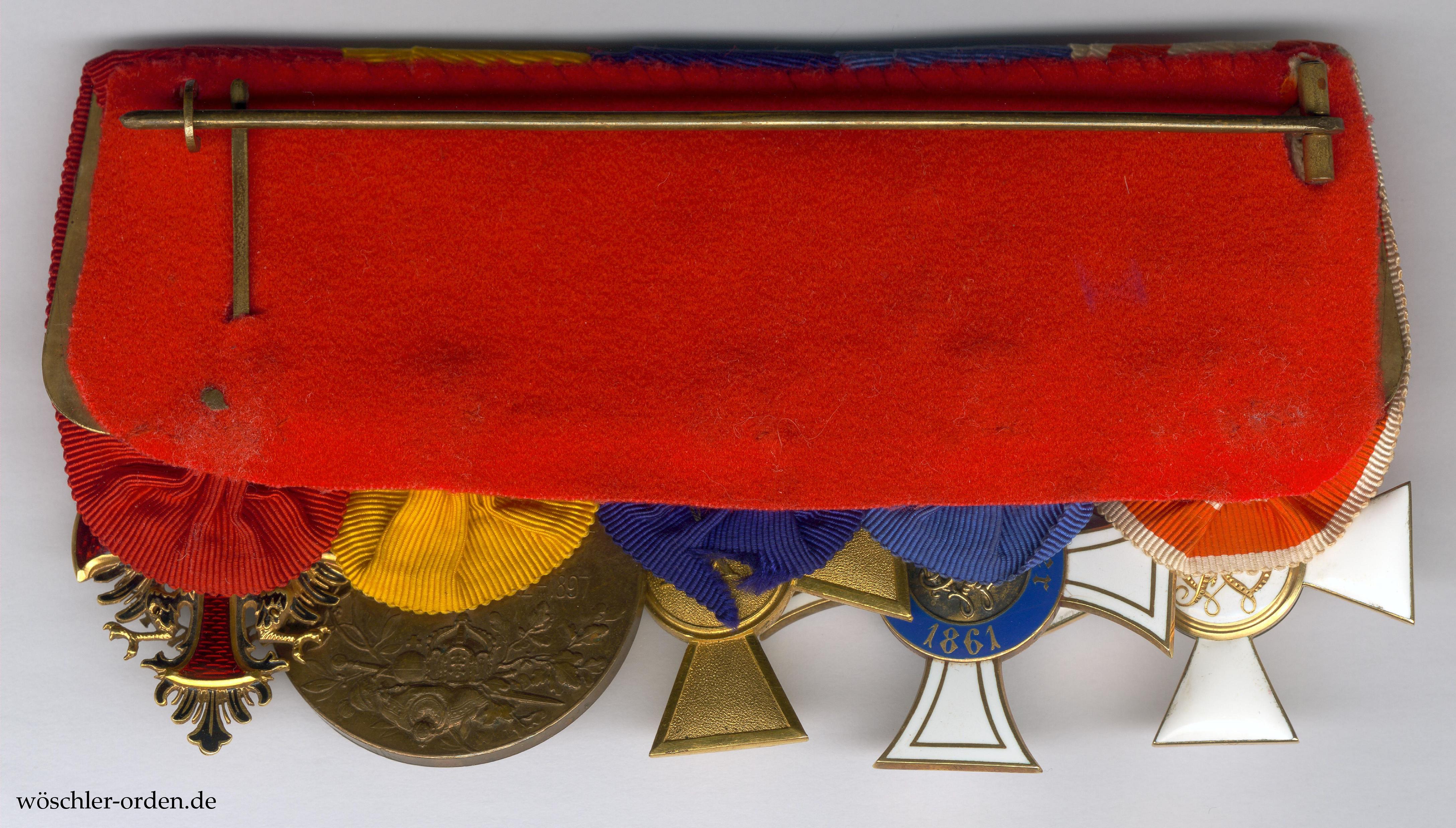 Königreich Preußen, 5er Ordensschnalle des Generalmajors Otto Sommerfeld (1856–1920), wohl aus der Zeit kurz vor Beginn des Ersten Weltkrieges, mit folgenden Auszeichnungen: