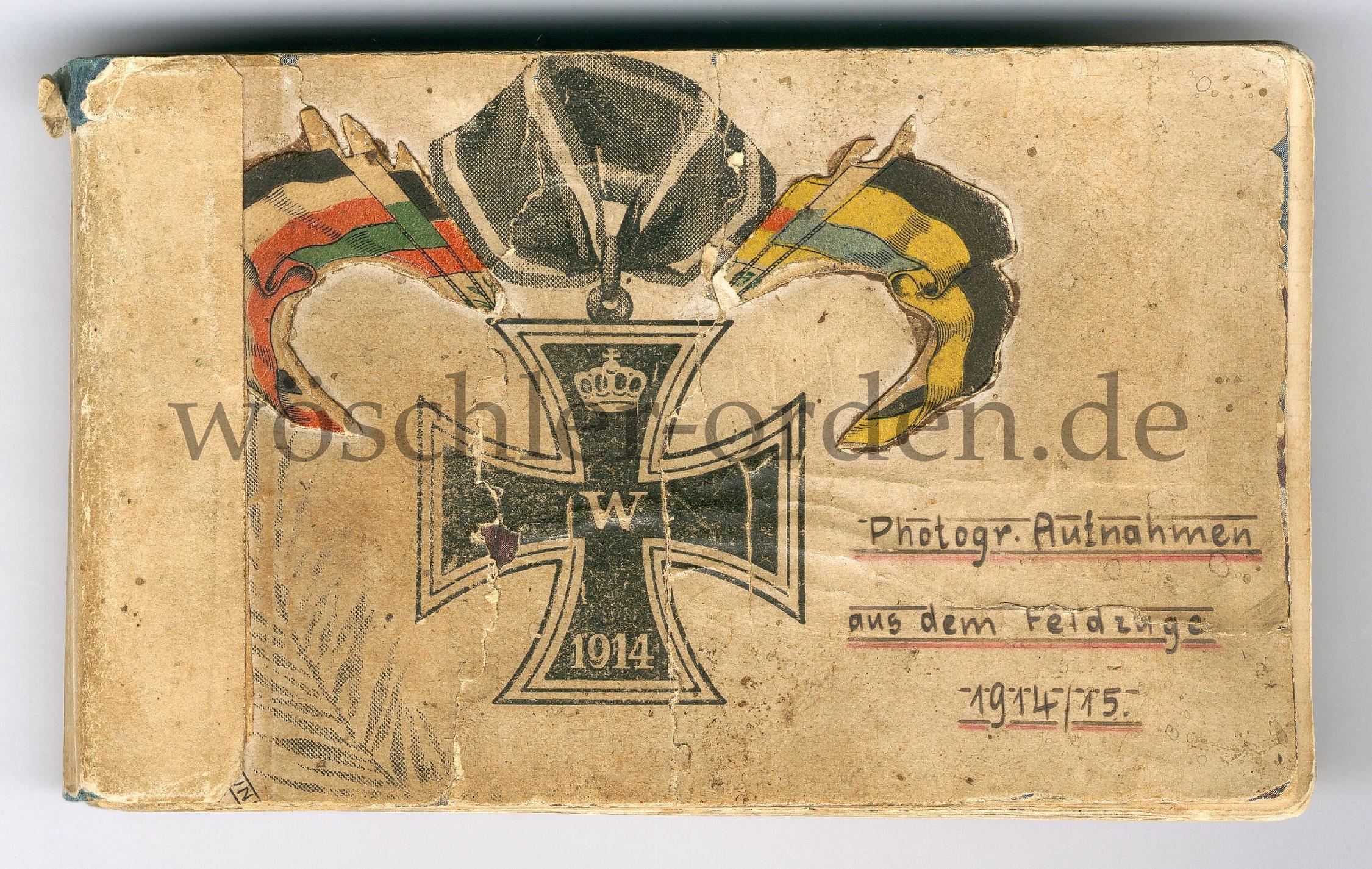 Dazu ein kleines, selbstgebasteltes Album mit „Photogr. Aufnahmen aus dem Feldzuge 1914/15.“ mit etwa 70, teils sehr kleinformatigen Bildern, die, außergewöhnlich sauber beschriftet, unter anderem Schützengräben und Unterstände, Quartiere, Weihnachtsfeiern, Kameraden usw. sowie Ansichten aus Tournai, Gheluwe, Orchies und Douau zeigen.