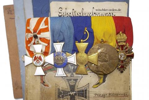 Die Ordensschnalle in guter, kaum getragener und bemerkenswert farbfrischer Erhaltung, die emaillierten Orden ohne erkennbare Beschädigungen, lediglich das Dienstauszeichnungskreuz etwas unschön nachfixiert. Das Photoalbum und die Soldbücher usw. teils mit geringeren, teils mit stärkeren Alters- und Gebrauchsspuren, jedoch durchwegs noch ansehnlich.