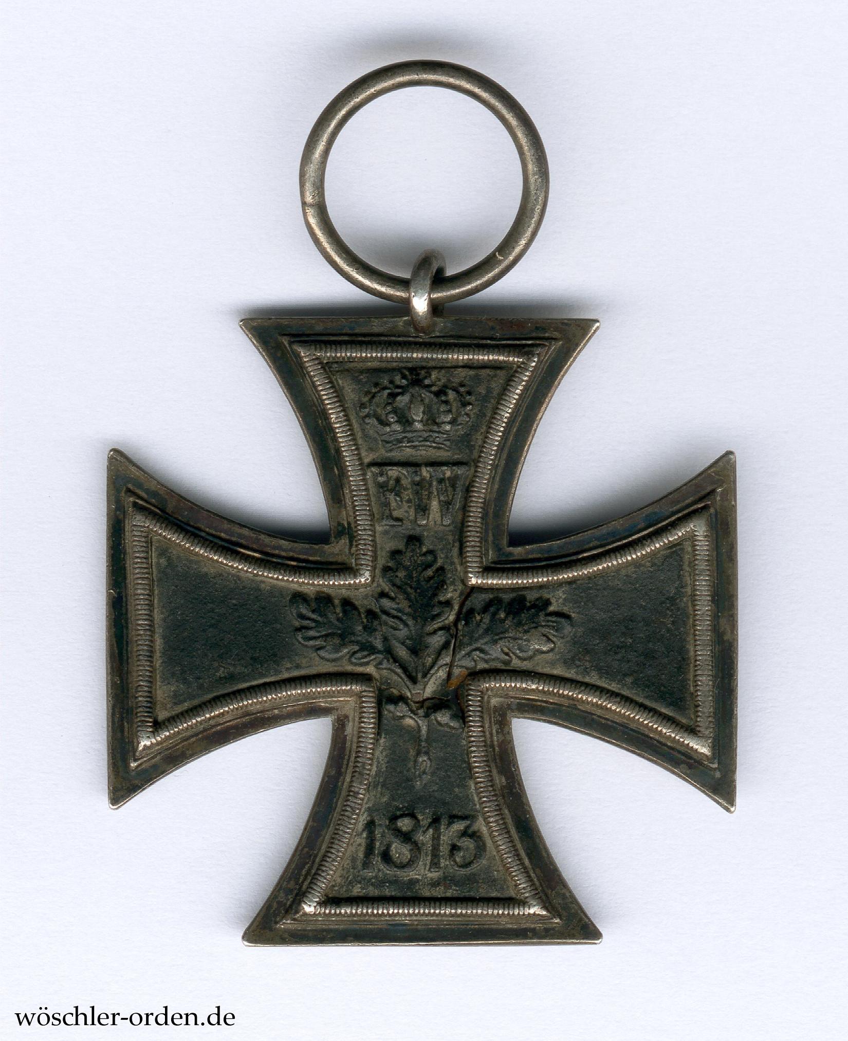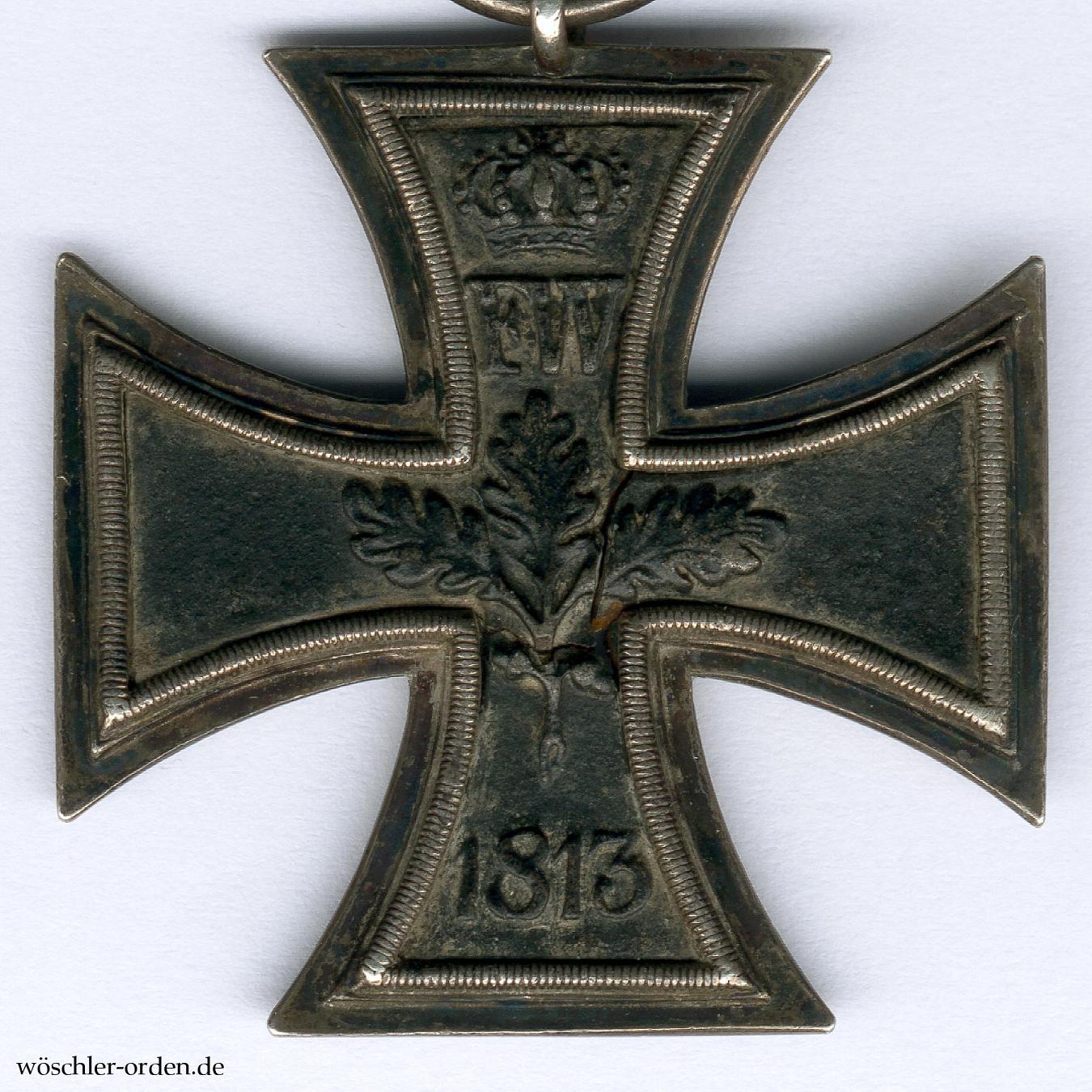 Probemäßiges Exemplar mit abgestuftem Gusseisenkern in aus zwei Silberblechen geprägter Zarge (Wernitz: „5-Teile-Modell“) mit normalbreitem Rand aus der Zeit der ersten Verleihungswelle bis 1818, an einseitig angelöteter Ringöse mit Bandring. Ein mutmaßlich fertigungsidentisches Exemplar ist bei Wernitz auf S. 26 abgebildet.