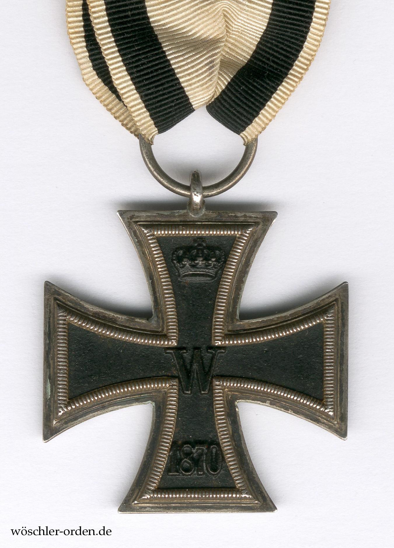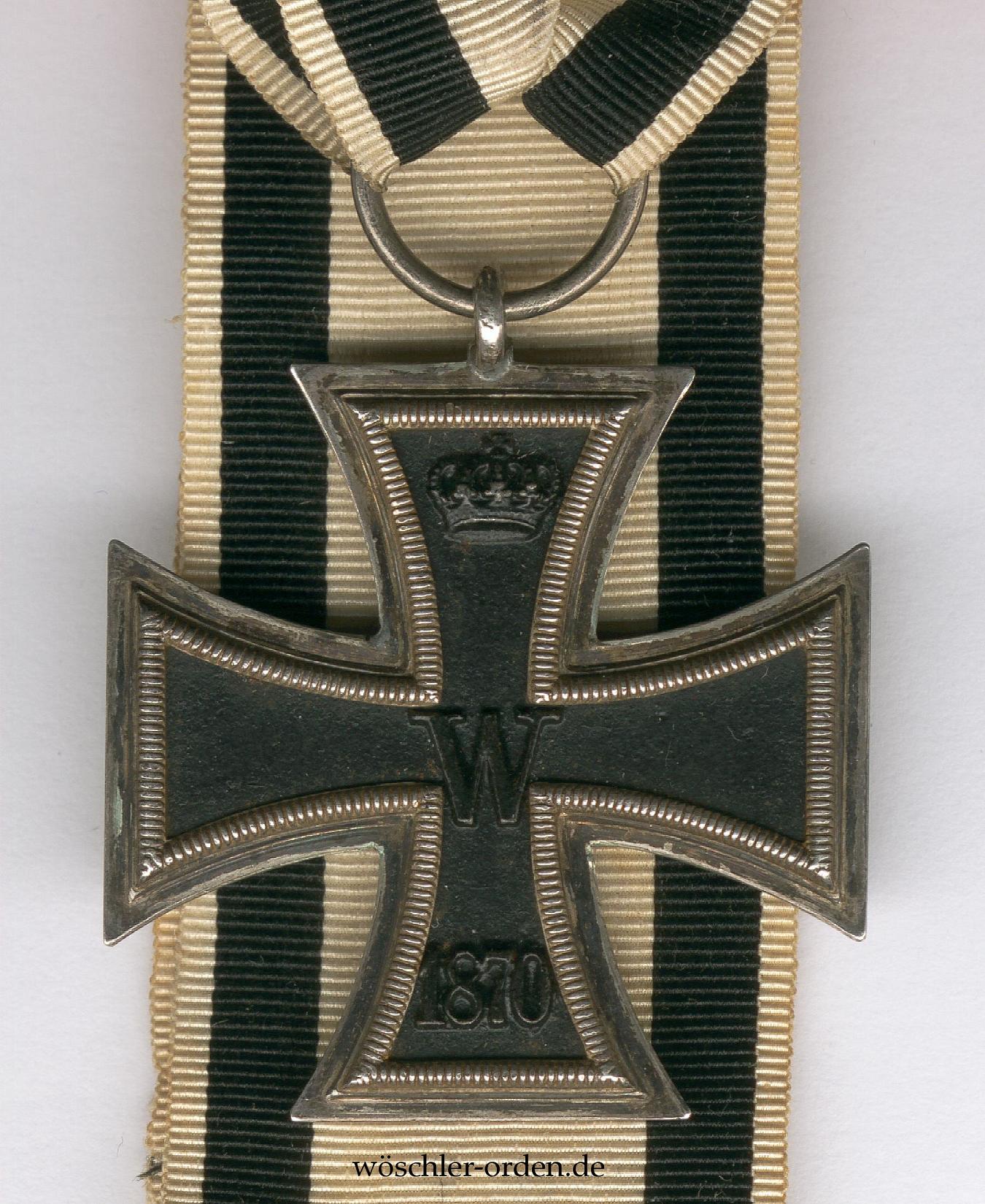 Das Eiserne Kreuz wurde durch König Wilhelm I. wenige Tage nach der Kriegserklärung Frankreichs an Preußen vom 19. Juli 1870 für den Deutsch-Französischen Krieg erneuert, der Erlass später auf den Tag der Kriegserklärung rückdatiert. Am weißen Bande mit schwarzer Einfassung erfolgten am insgesamt etwa 4100 Verleihungen.