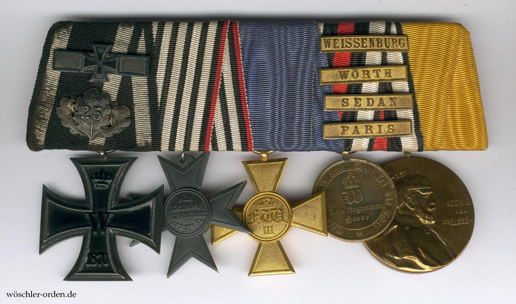 Königreich Preußen, 5er Ordensschnalle eines Veteranen des Deutsch-Französischen Krieges von 1870/71 aus dem Ersten Weltkrieg, mit folgenden Auszeichnungen:
