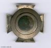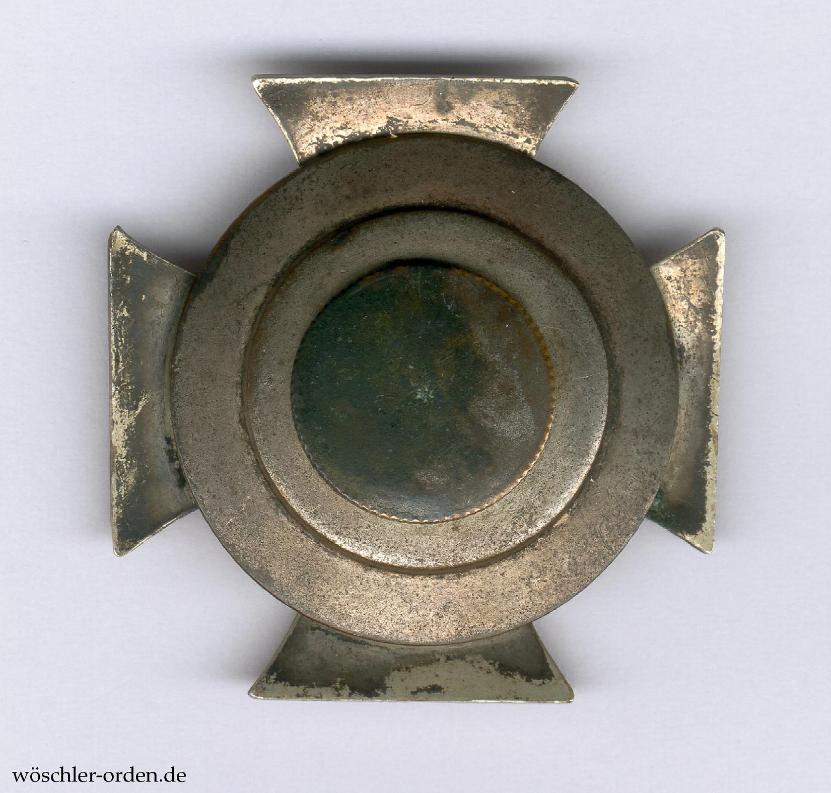 Mutmaßlich zeitgenössische, nicht-probemäßige Zweitfertigung in leicht gewölbter Ausführung mit aus Eisenblech geprägtem, brüniertem Kern in versilberter Zarge. An kleiner Schraubscheibe mit größerer Unterlegscheibe, erstere mit „Sternchen“-Punze. Ohne eine Herstellerkennzeichnung, jedoch sicherlich aus Fertigung der Firma C. F. Zimmermann, Pforzheim, stammend.