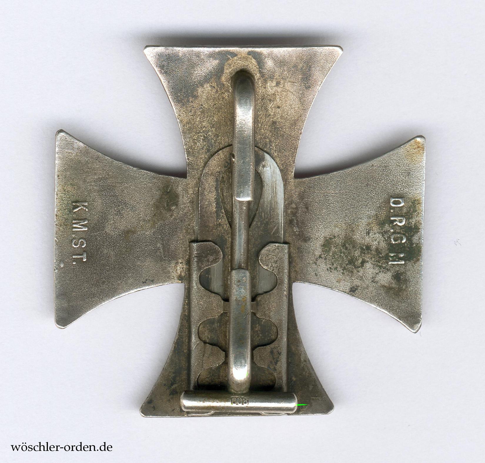 Nichtprobemäßige Zweitfertigung in leicht gewölbter Ausführung mit geprägtem Eisenkern in Silberzarge, rückseitig aufwändiger Schiebeverschluss und mitgeprägte Musterschutzangabe „D.R.G.M.“ sowie Herstellermarkierung „K.M.ST.“ der Königlichen Münze, Abteilung Orden, Stuttgart. Am Schieber Punze „800“ für den Feingehalt.