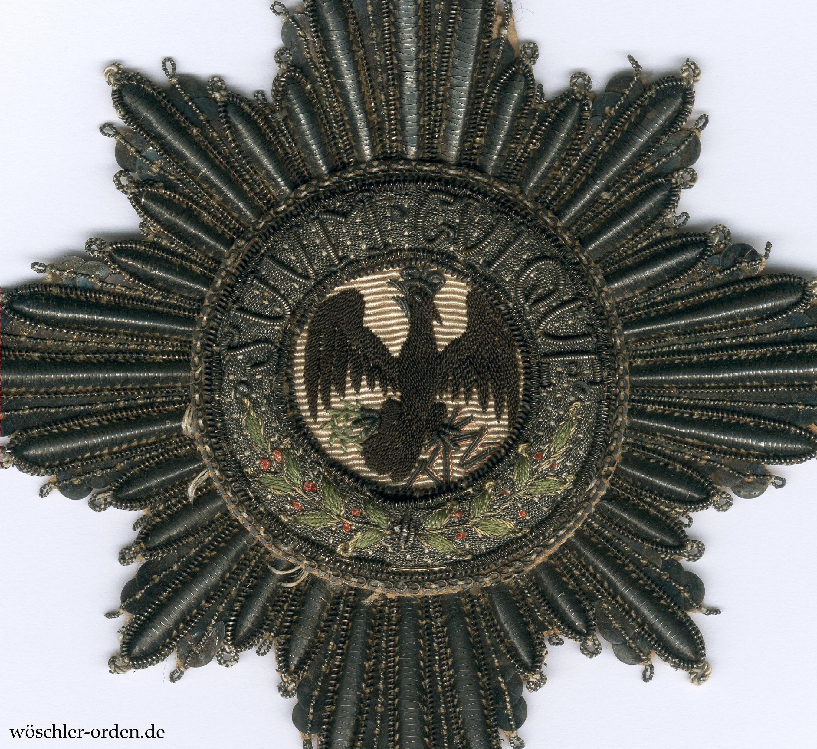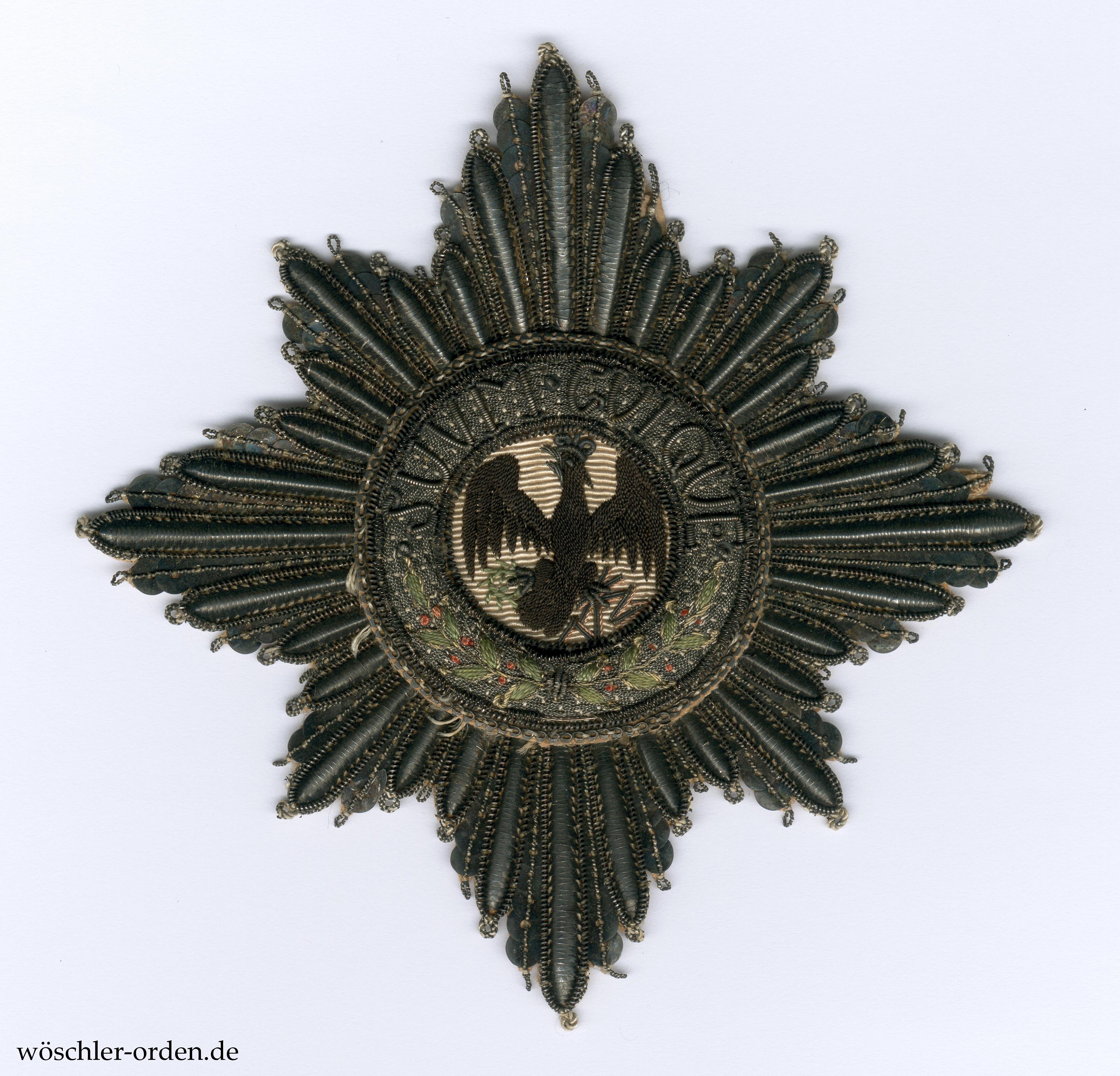Bruststern der Ordensritter in gestickter Ausführung, wie er bis zur Einführung metallener Sterne im Jahr 1858 verausgabt wurde. Pailletten, Silberlaan- und Seidenstickerei, etwa 11,5 cm x 11,5 cm. Die Strahlenspitzen jeweils mit Ösen zum Annähen. Rückseitige Papierabdeckung unsigniert, jedoch der Werkstatt H. Fehrmann, Berlin, und dem ersten Drittel des 19. Jahrhunderts zuzuordnen.