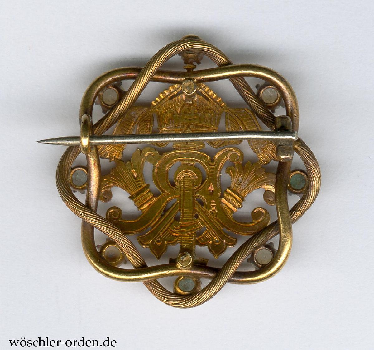 Gold, Emaille, Perlen und Saphire(?). Die Brosche besteht aus zwei ineinander geflochtenen Ringen, die den Dornenkranz Jesu Christi symbolisieren, in den Zwischenräumen vier Saphire und vier Perlen, in der Mitte das goldene, teils rot-blau emaillierte, legierte Monogramm „W I R“ unter der Kaiserkrone mit Schleifenbandeaus. Die Ringe sind in dunklerem, wohl Rotgold ausgeführt, das Monogramm in hellerem Gelbgold. Vor allem auf der Rückseite ist das Monogramm feinst nachgraviert. Der Nadelhaken mit Feingehaltspunzierung „585“.