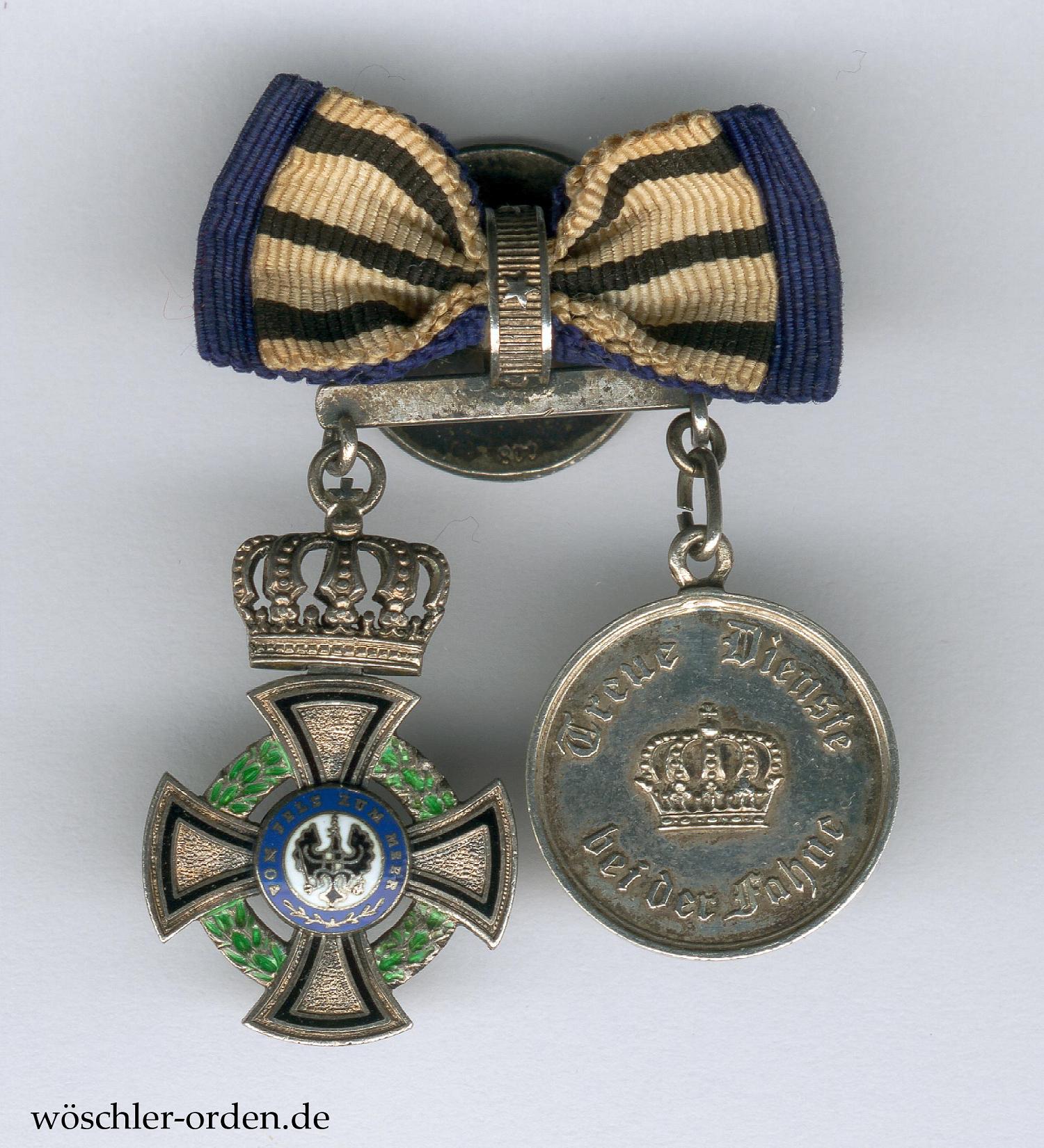 Zusammen an echt silbernem Knopf von J. Godet & Sohn, Berlin. Die Miniaturen wohl ebenfalls echt Silber, der Hohenzollernsche Hausorden an beweglicher Krone und mit aufgelegten Medaillons, in ganz hervorragender Berliner Vorkriegs-Juweliersqualität.