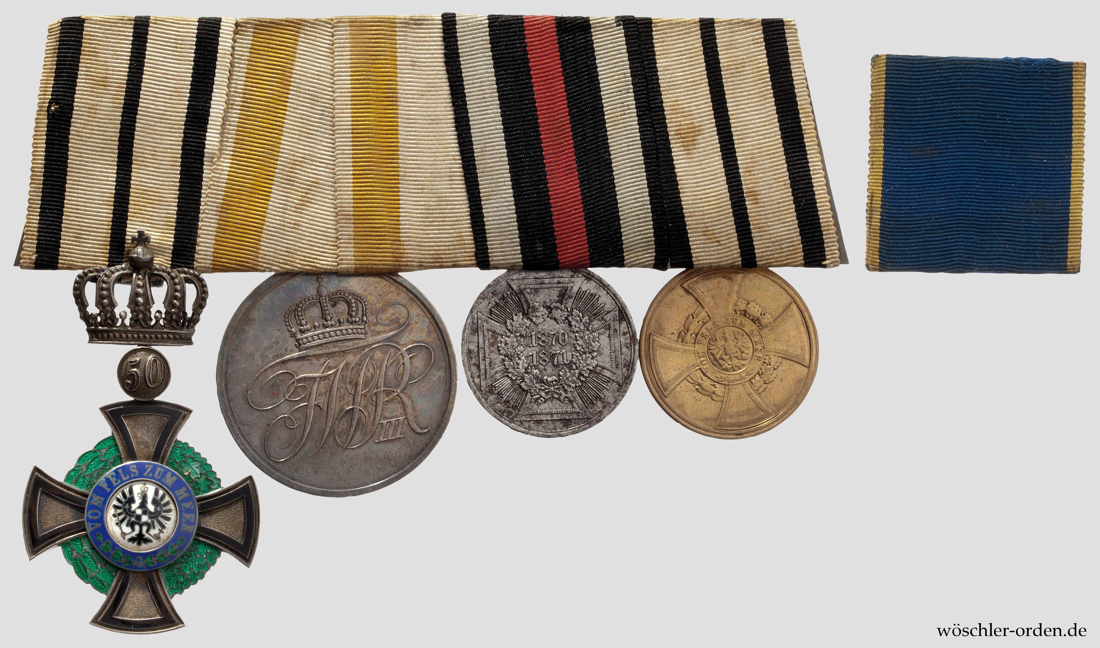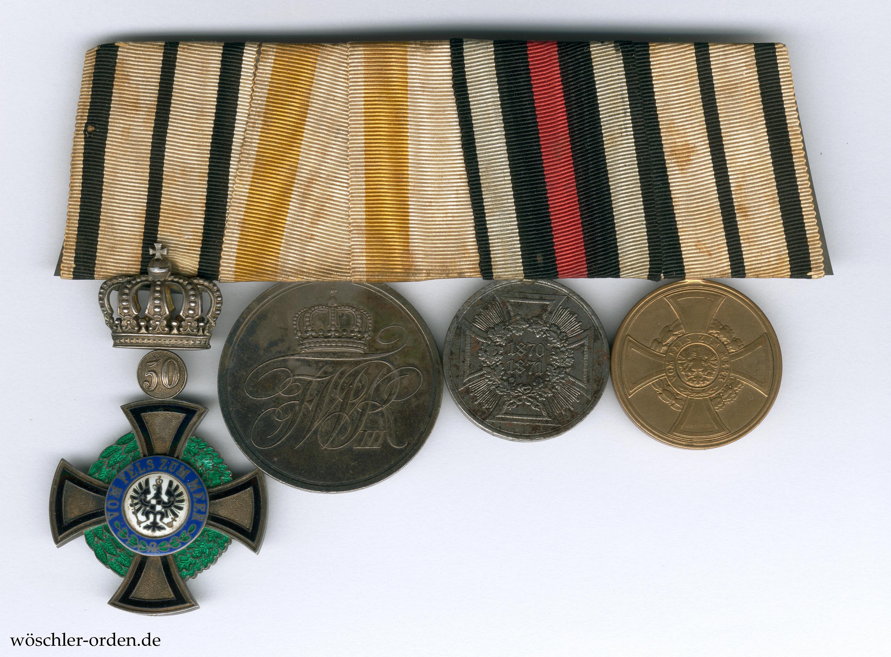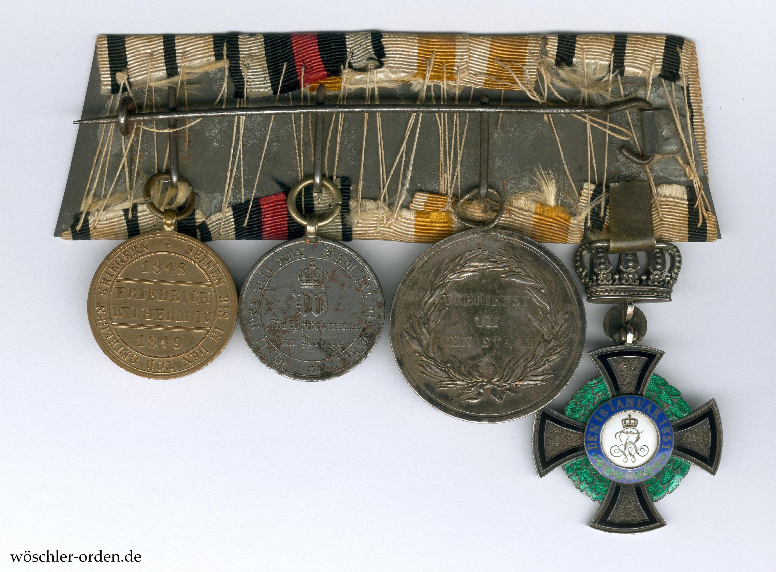 Preußen, 4er Ordensschnalle wohl eines langgedienten Veteranen der Kämpfe von 1848/49, mit folgenden Auszeichnungen: