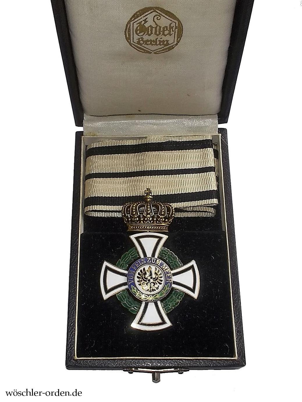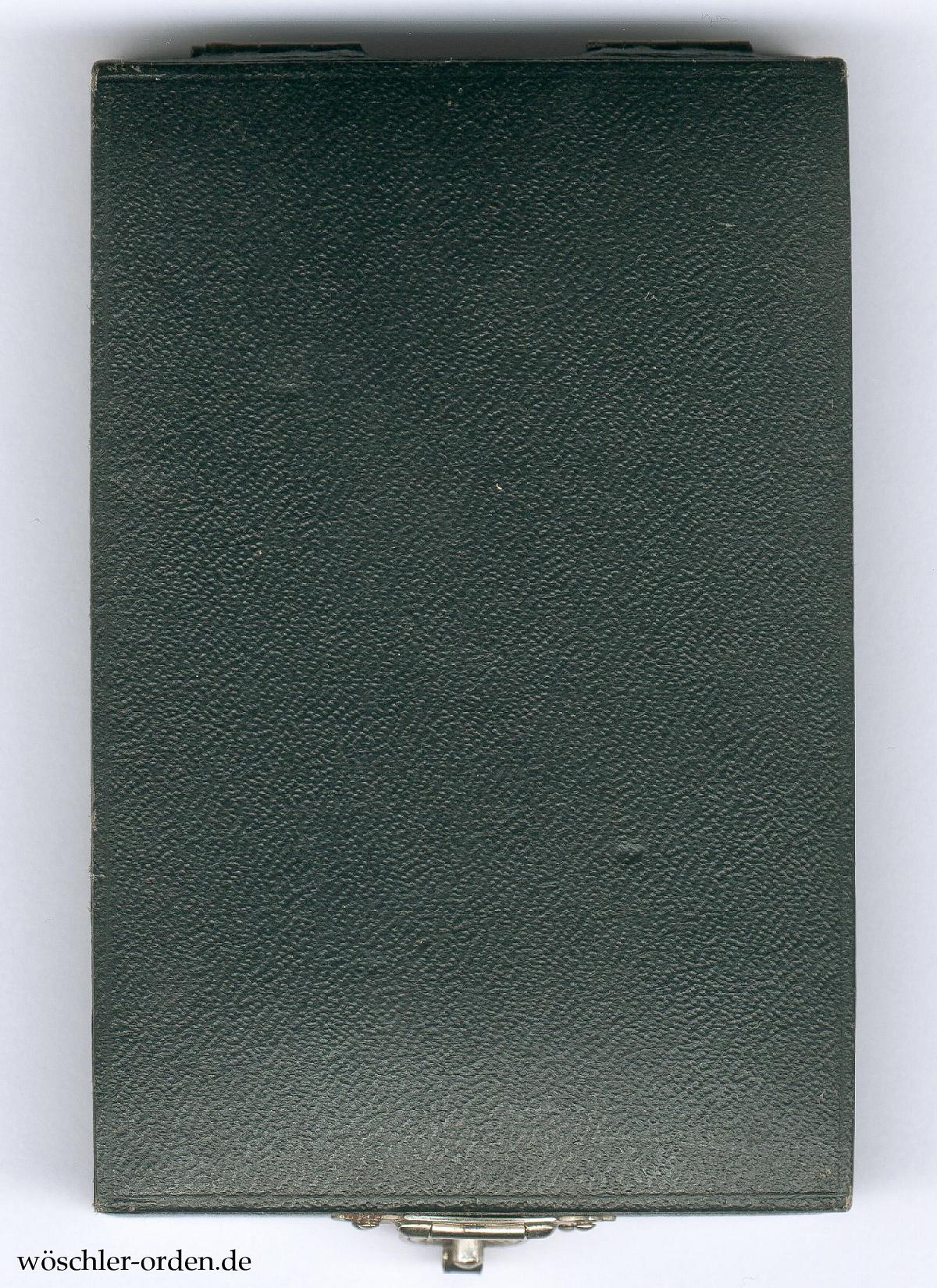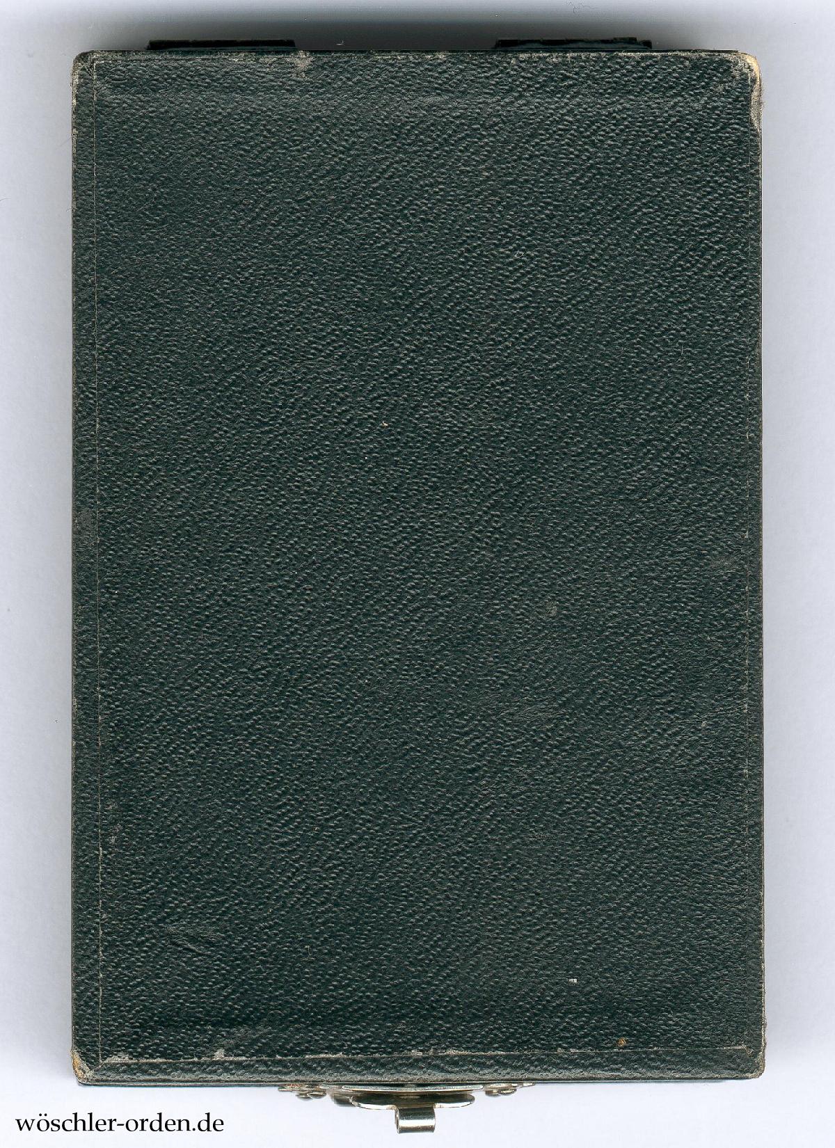 Dazu das schmucklose, mit schwarzem Papier bezogene Verleihungsetui mit Zierverschluss. Innen schwarzes Samtkissen mit Aussparung für das Ordenskreuz, der Deckel in weißer Seide, mit goldgeprägtem Herstellersignet „Godet / Berlin“. Inliegend etwa 29 cm (!) langes Bandstück.