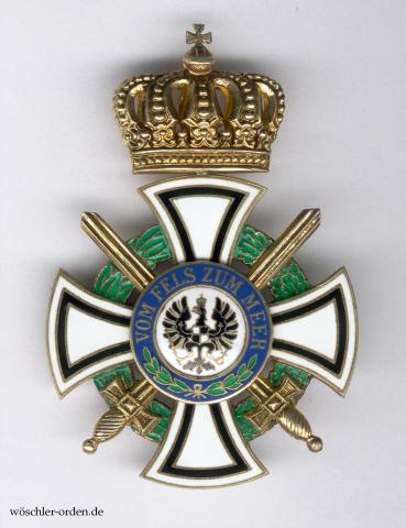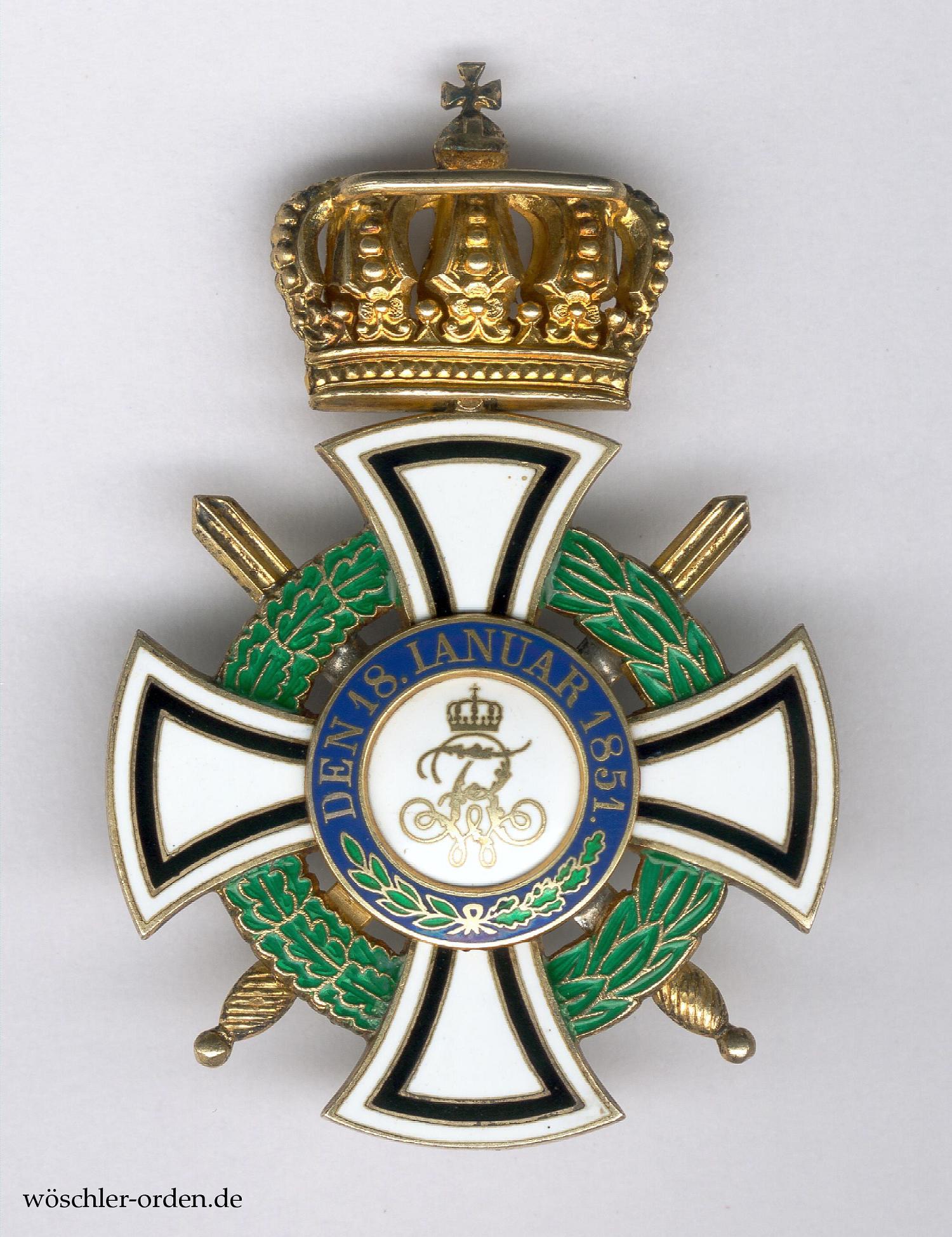Der Königliche Hausorden von Hohenzollern wurde durch König Friedrich Wilhelm IV. am 18. Januar 1851 gestiftet, nachdem in Folge des Staatsvertrages vom 7. Dezember 1848 mit den Fürstentümern Hohenzollern-Sigmaringen und Hohenzollern-Hechingen auch deren Fürstlicher Hausorden in die Reihe der preußischen Orden überging. Der in ursprünglich drei Klassen – Großkomture, Komture und Ritter – neugestiftete Königliche Hausorden bestand aus zwei Abteilungen, deren erste, aus Kreuzen bestehend, für Verdienste um das Königliche Haus verliehen werden sollte. Die Dekorationen der zweiten Abteilung bestanden aus Adlern, sie waren „zur Belohnung besonderer Verdienste um die Pflege gottesfürchtiger und treuer Gesinnung unter der Jugend bestimmt“. Im Jahr 1861 wurden zusätzliche Bruststerne zu den Großkomturen und Komturen gestiftet, die regelmäßig als eigenständige Ordensstufen verliehen wurden, außerdem eine unterste, „Inhaber“ genannte Klasse für beide Abteilungen. Alle Klassen der ersten Abteilung konnten ab 1864 „für Verdienste vor dem Feind“ mit Schwertern verliehen werden, die in später verliehenen Friedensklassen als „Schwerter am Ringe“ dargestellt wurden. Grundsätzlich konnte der Orden mit Dienstaltersabzeichen, den sog. Jubiläumszahlen, verliehen werden.