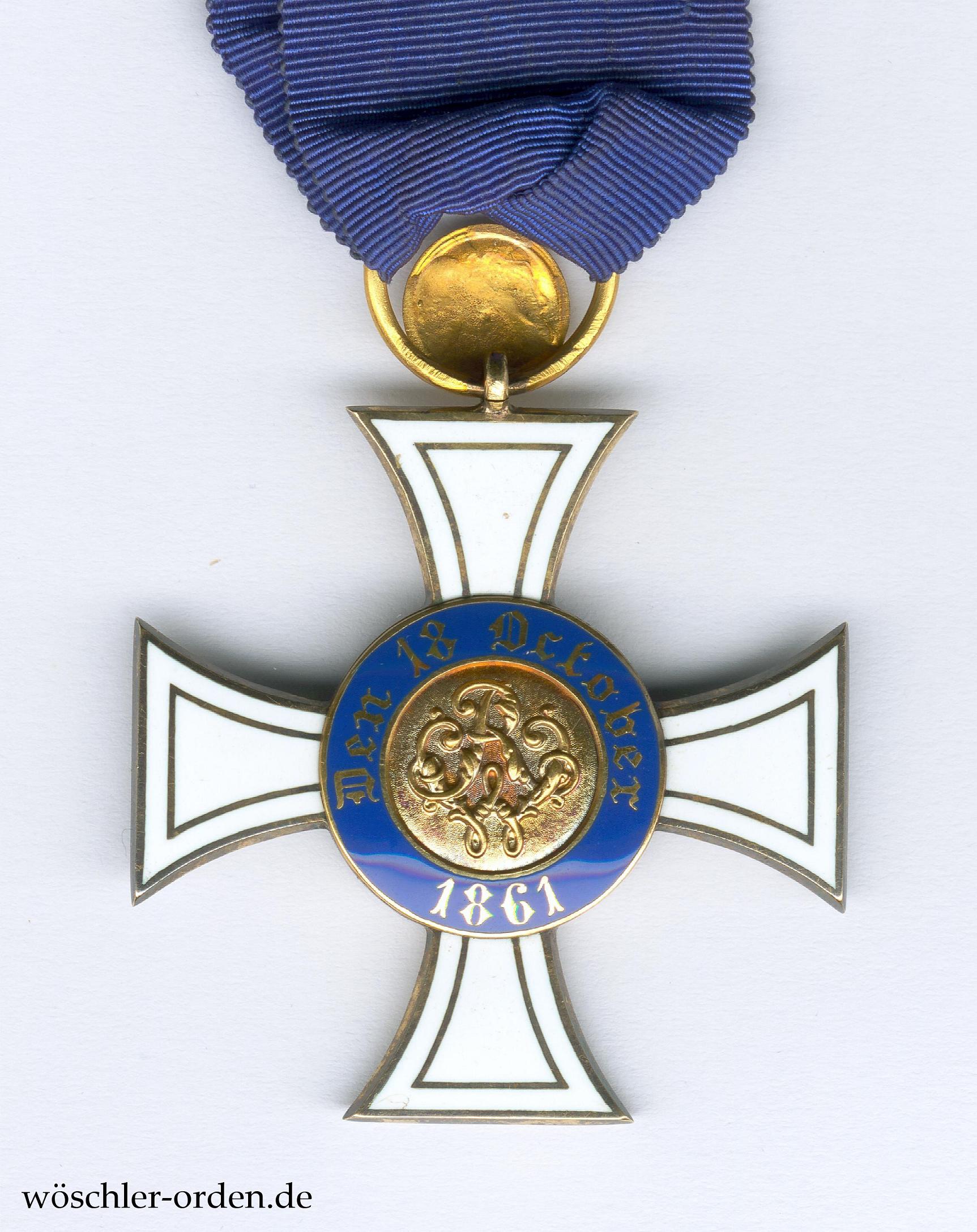 Exemplar des dritten und endgültigen, ab Mitte 1868 gefertigten und seit Anfang 1869 verliehenen Modells mit der großen, preußischen Königskrone im Medaillon der Vorderseite, in der ersten, bis Ende 1916 gefertigten Ausführung. Gold und Emaille, hohl gefertigt, mit Ritzmarke „W“ der Hofjuweliere Johann Wagner & Sohn, Berlin, am unteren Kreuzarm.