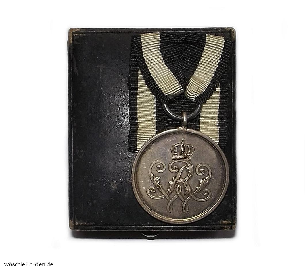 Probemäßiges Exemplar des zweiten, wohl ab etwa 1873 geprägten Modells mit dem Monogramm König Wilhelm I., wie es bis zum Ende der Monarchie und somit der Verleihungen 1918 vergeben wurde. Silber, an angelöteter Ringöse mit Bandring.