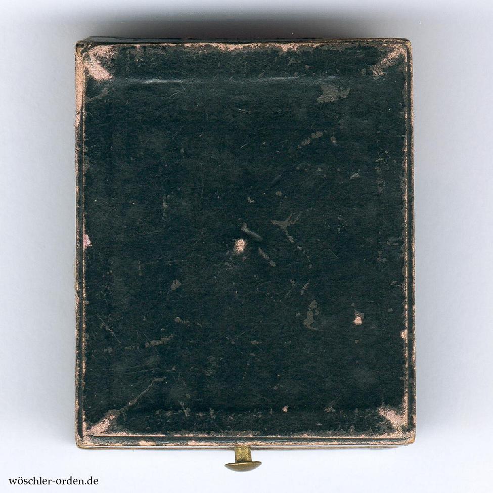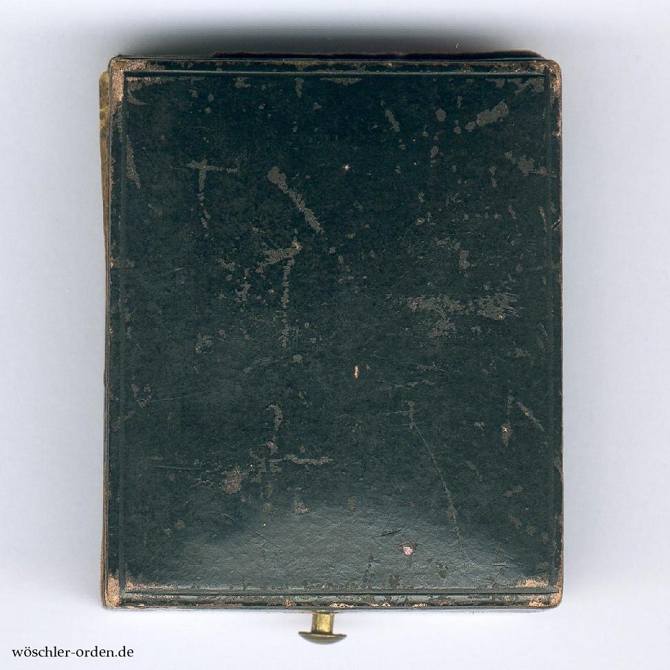 Dazu das mit schwarzem Papier bezogene Verleihungsetui aus Fertigung der Firma H. F. Schwartz, Berlin, innen mit schwarzer Samteinlage und ebenfalls schwarzer Seidenverkleidung im Deckel, die inneren Kanten mit goldenen Zierleisten beklebt.