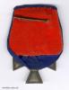 An sauber mit bogenförmig vernähtem Band konfektionierter Einzel-Ordensschnalle, diese rückseitig mit roter Stoffabdeckung und stabilem Nadelsystem.