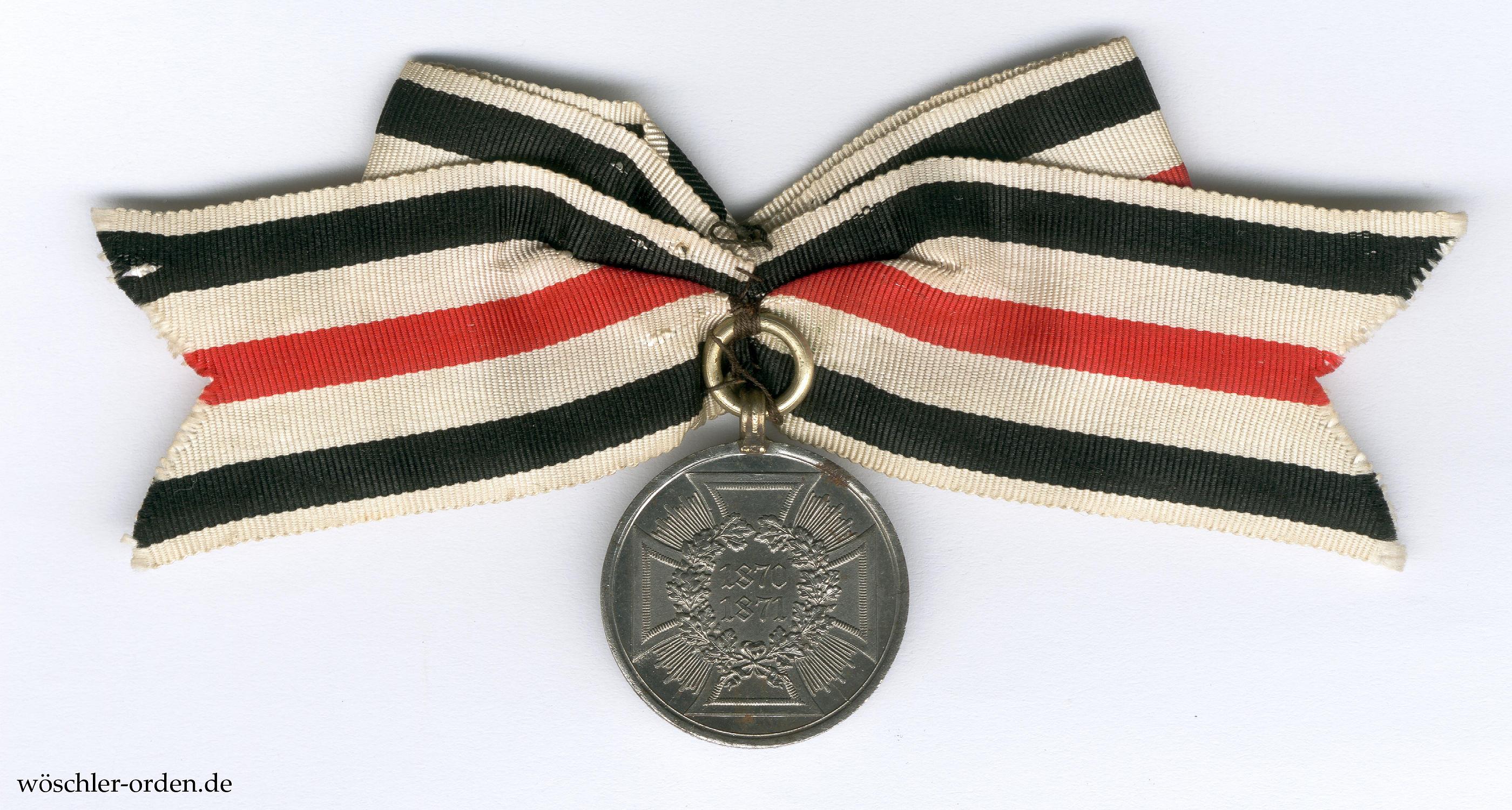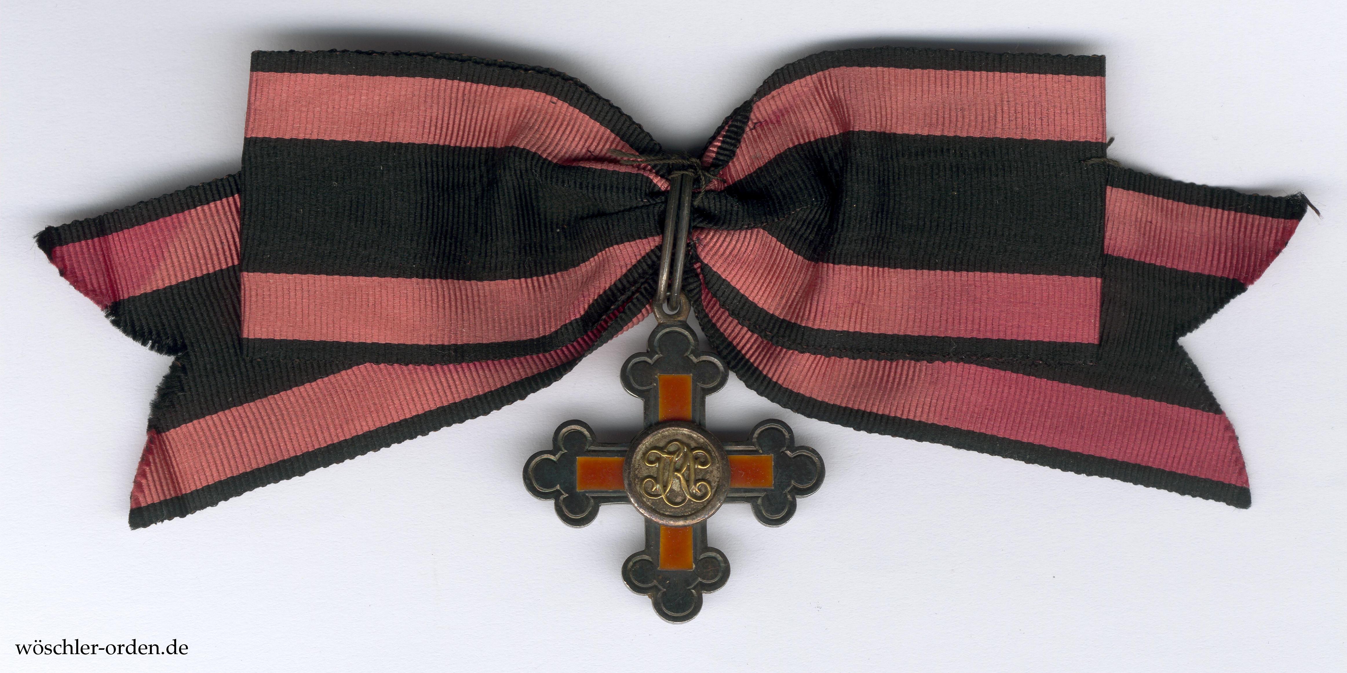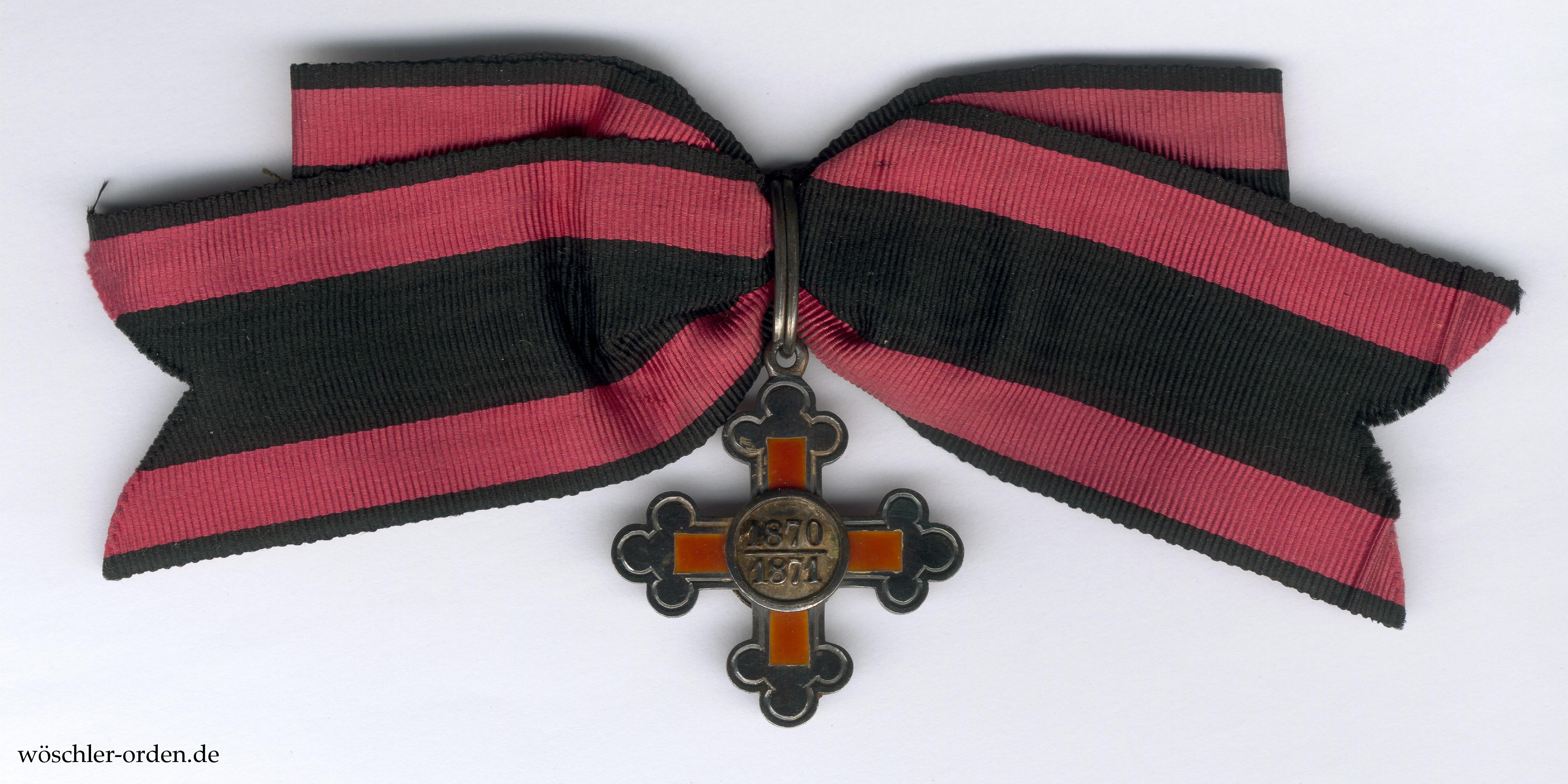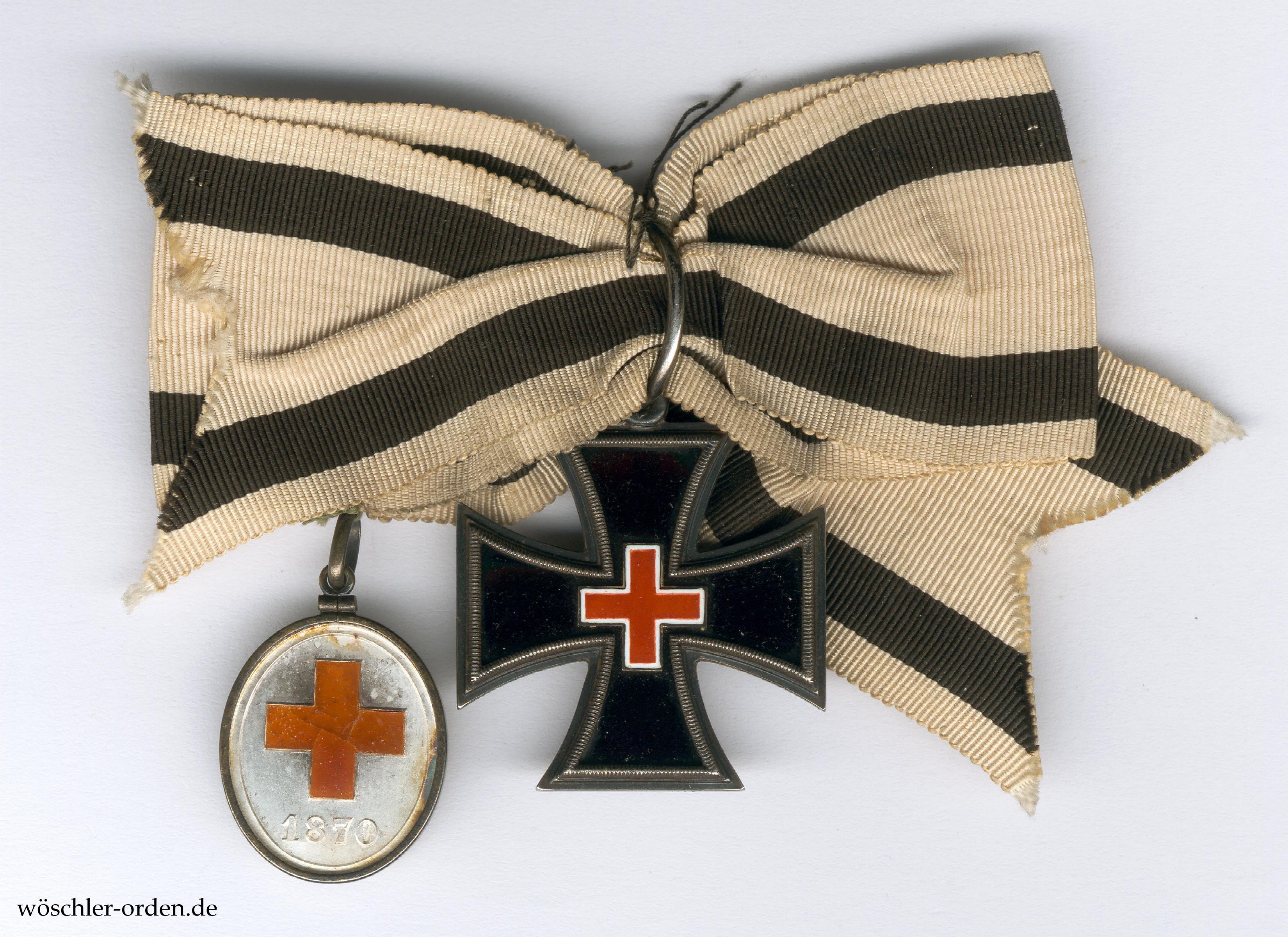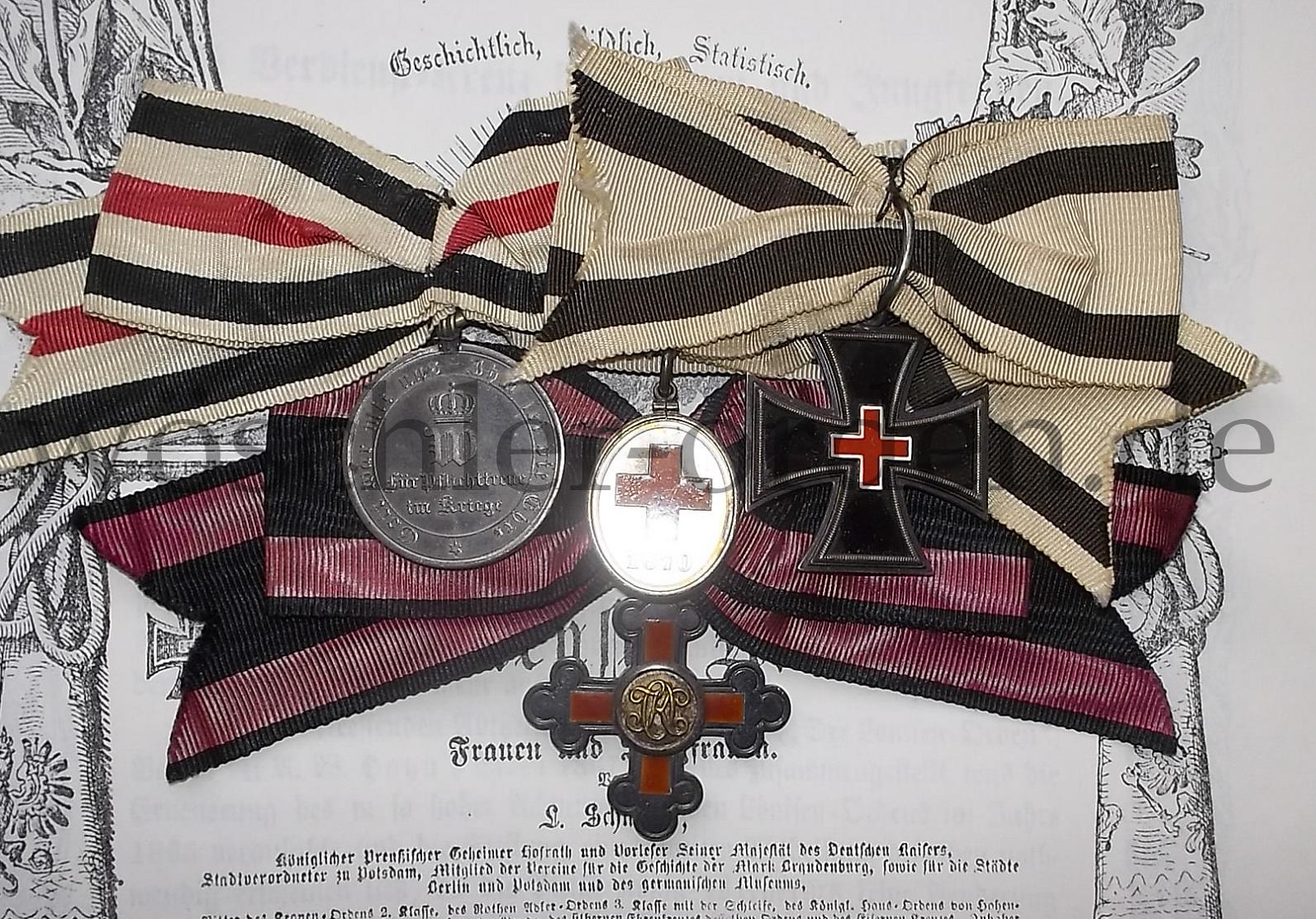 Königreich Preußen, Auszeichnungsnachlass einer Dame, die für ihre Tätigkeit während des Deutsch-Französischen Krieges 1870/71 vierfach ausgezeichnet wurde, bestehend aus dem preußischen Verdienstkreuz für Frauen und Jungfrauen, der Kriegsdenkmünze 1870/71 in Stahl am Band für Nichtkämpfer und dem württembergischen Olga-Orden, jeweils als verliehenes, probemäßiges Original an besonders hübsch vernähten, einzelnen Damenschleifen, ohne rückseitige Tragenadeln.