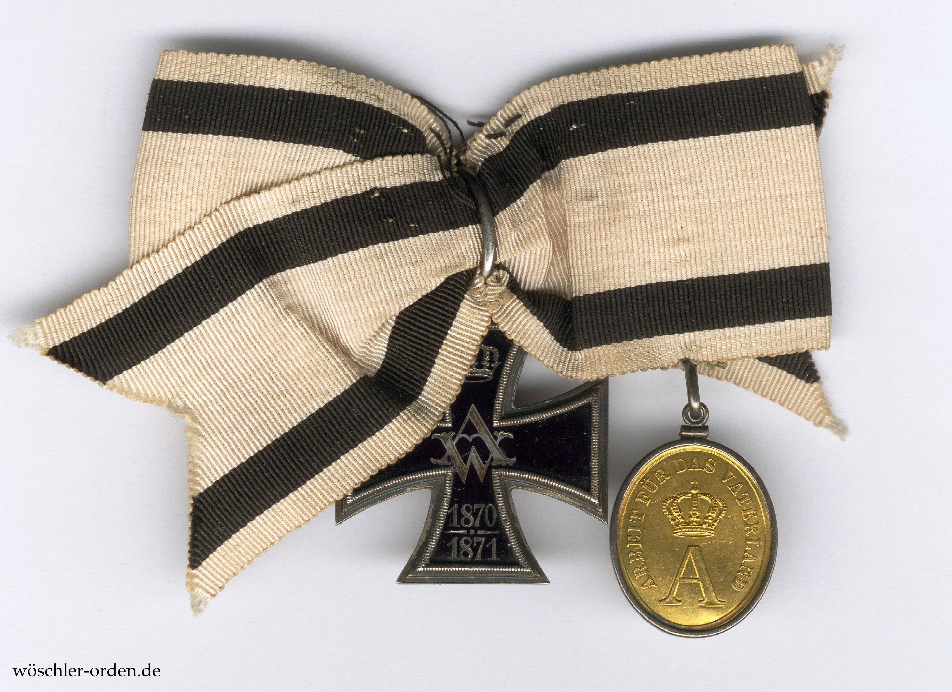 An der Schleife des Verdienstkreuzes für Frauen und Jungfrauen zusätzlich vernäht befindet sich die Medaille „Arbeit für das Vaterland“. Diese besteht vorderseitig aus einem silbernen Medaillon mit dem wohl lackierten(!) Genfer Kreuz über der Jahreszahl „1870“, rückseitig aus einem goldenen Medaillon, das das gekrönte Monogramm der Königin Augusta, darum die Inschrift „ARBEIT FÜR DAS VATERLAND“ zeigt. Die beiden Medaillons, hochoval etwa 24 mm x 20 mm messend, sind zusammen gefasst, wobei die Vorderseite durch ein Glasscheibchen(!) geschützt ist.