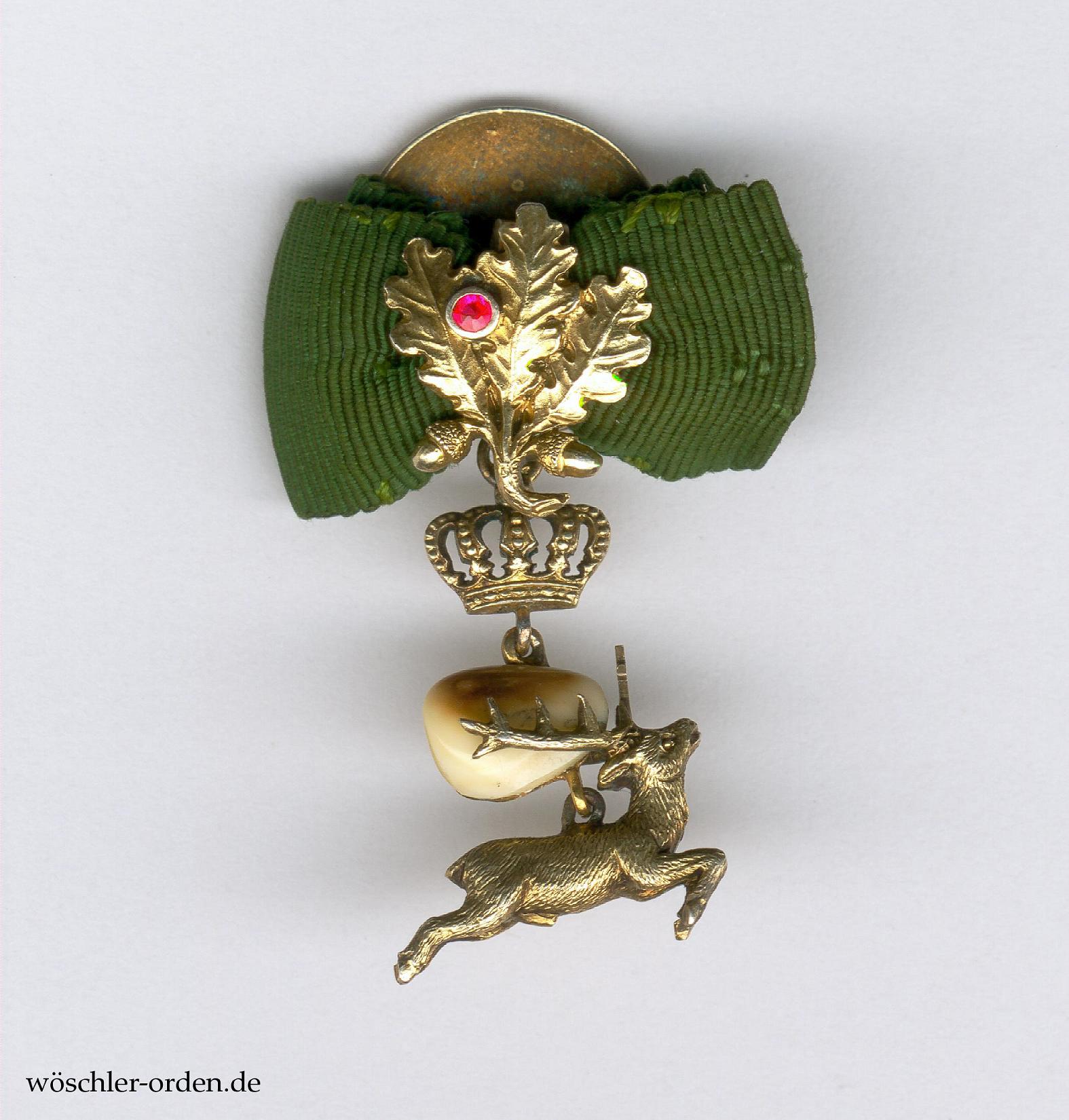 Silber vergoldet, mehrteilig gefertigt. Der Edelhirsch mit feinst nachgraviertem Fell und Stirnkreuz, beweglich an Hirschgrandl unter beidseitig gefertigter Königskrone hängend. An grüner Bandschleife mit aufgelegtem Eichenbruch mit kleinem Rubin. Rückseitig vergoldeter Trageknopf der Kgl. Hofjuweliere J. Godet & Sohn, Berlin.