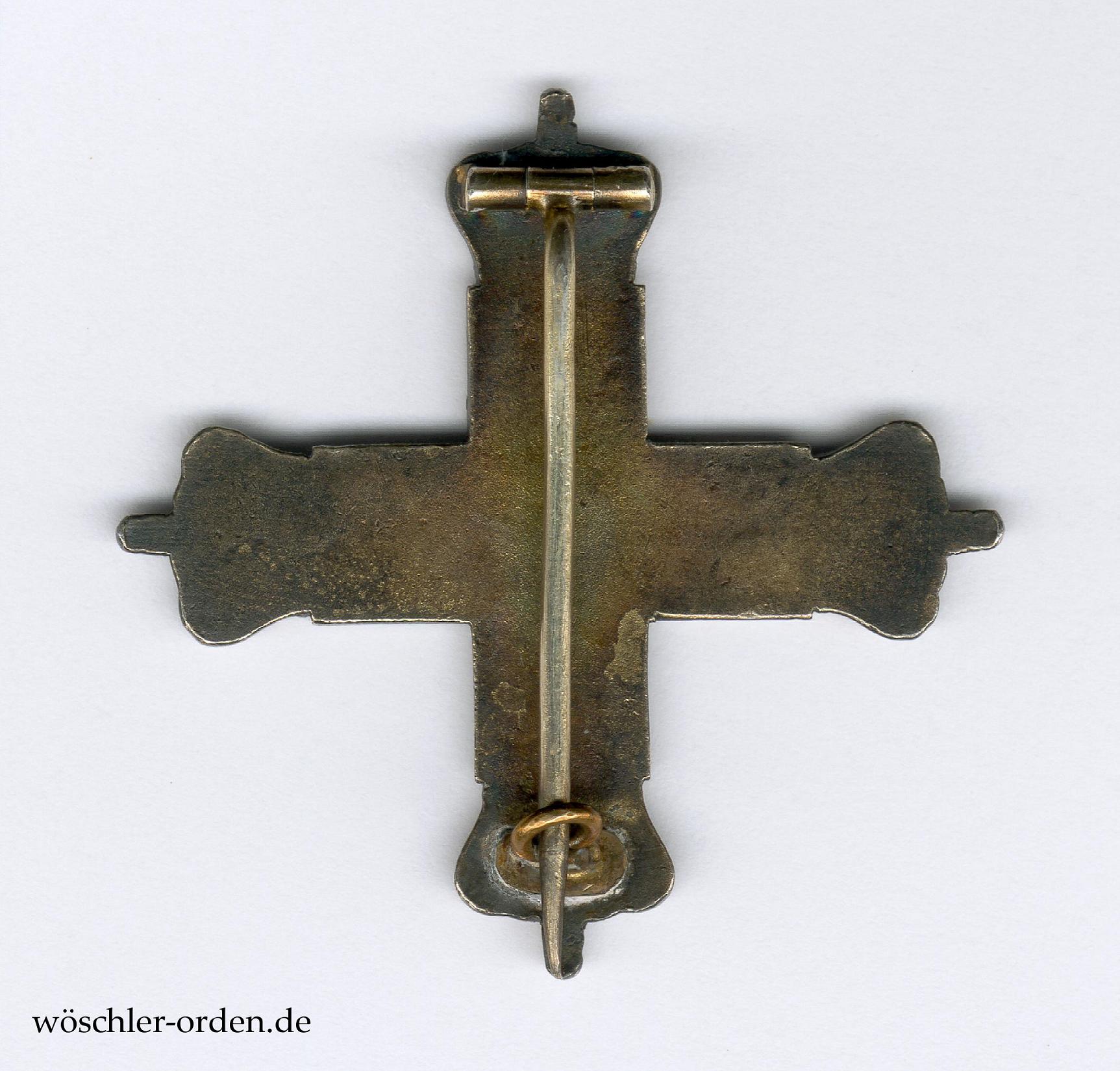 Sichtlich getragene Erhaltung mit zahlreichen Rissen in der Emaille, der rückseitige Nadelhaken wohl ersetzt oder zumindest mit einem Plättchen verstärkt. Der Haken außerdem verbogen, sodass sich die Nadel nicht öffnen lässt.