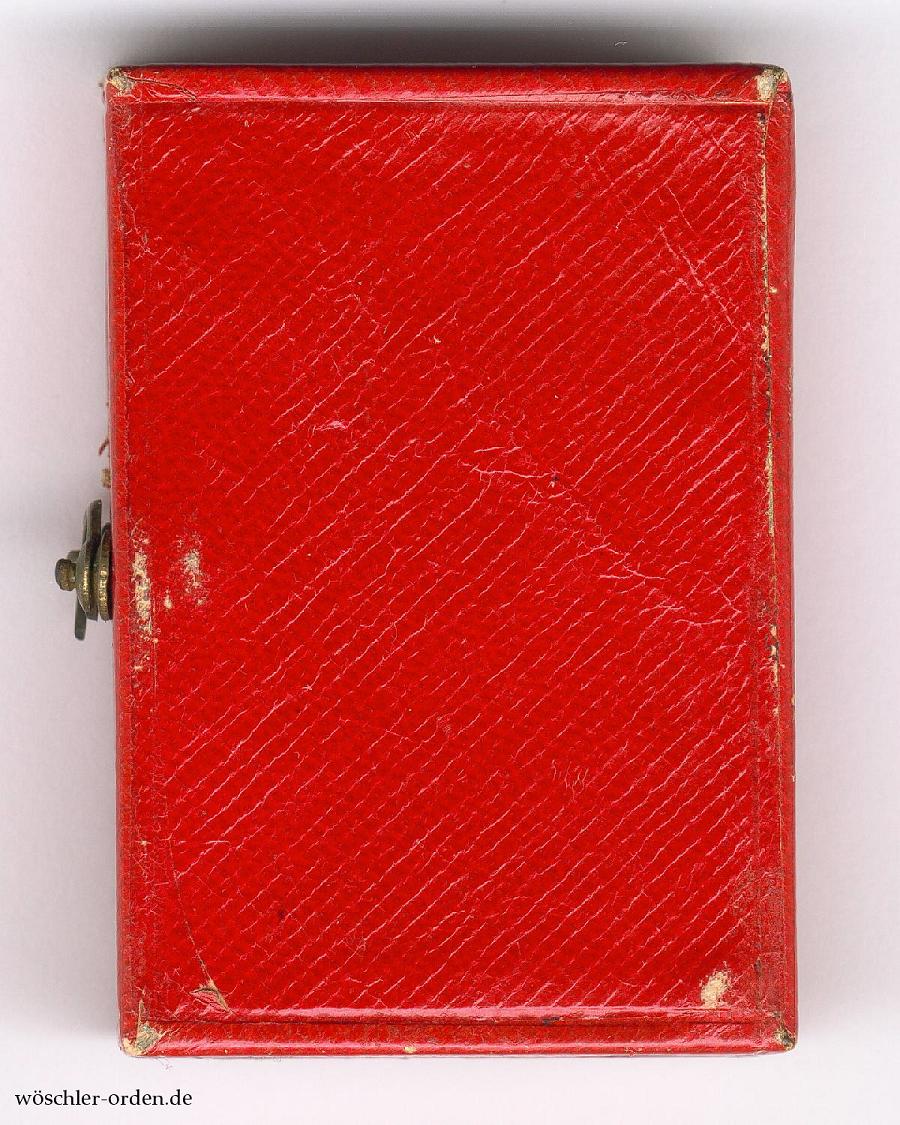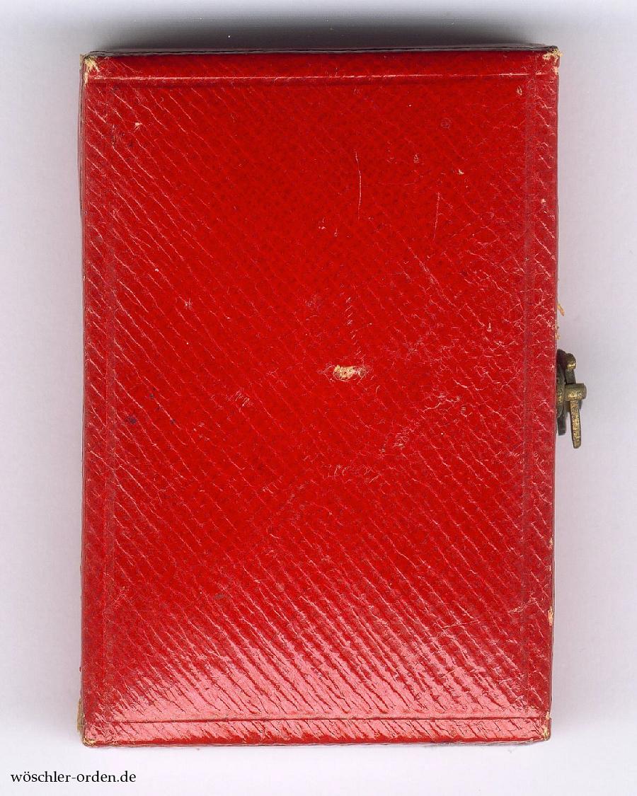Dazu das zeitlich passende Verleihungsetui aus Fertigung der Firma H. F. Schwartz, Berlin, in echtem Maroquinleder und mit Häckchenverschluss, innen in schwarzem Samt und schwarzer Seide, die inneren Kanten mit goldenen Zierleisten beklebt.