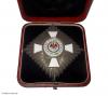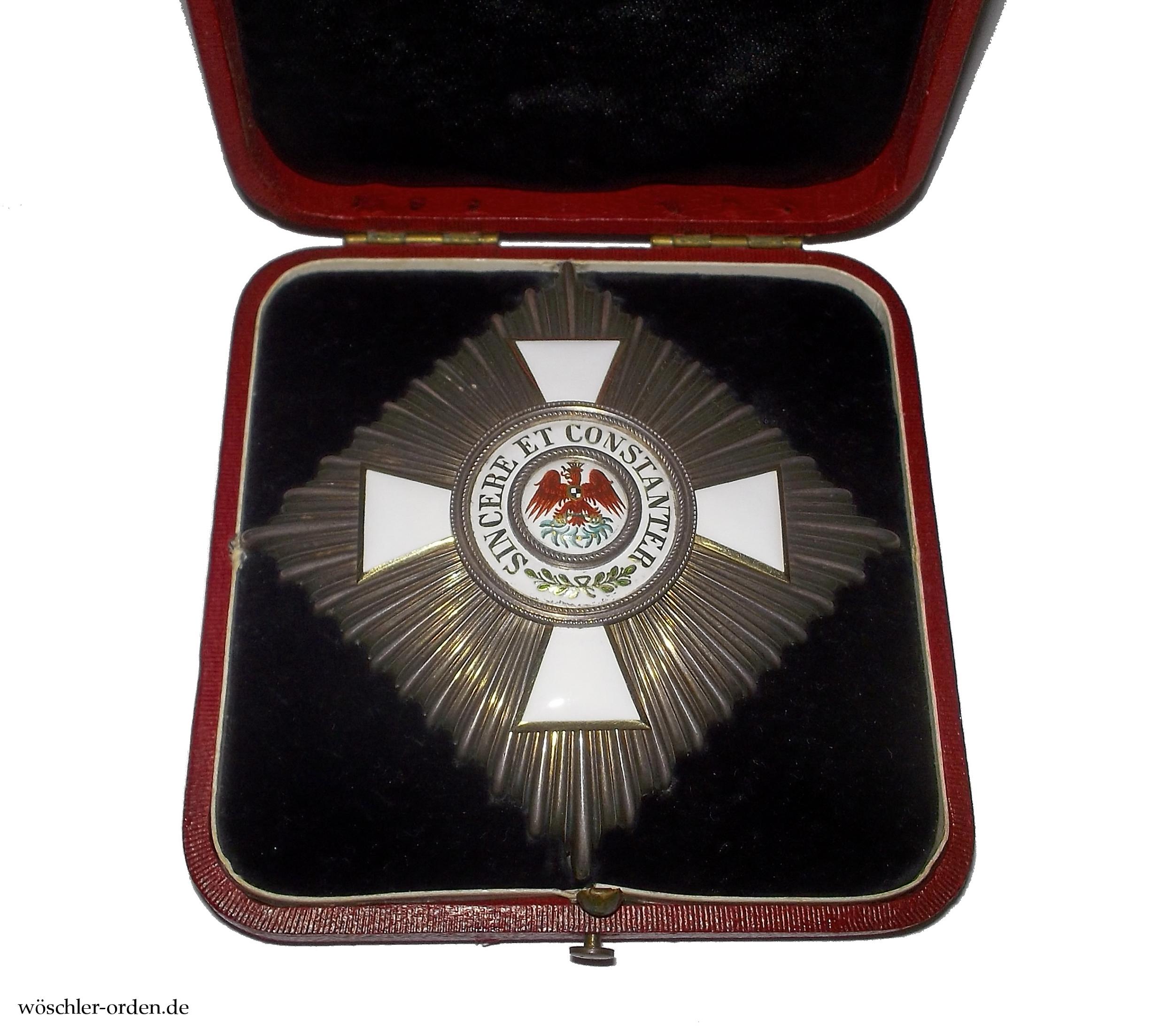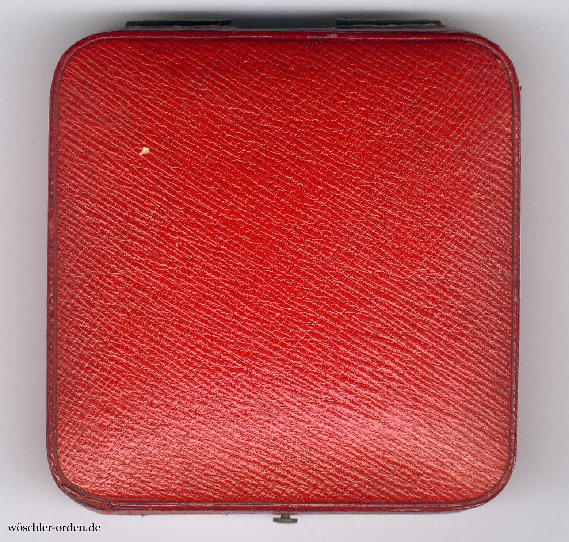 Dazu das passende Verleihungsetui aus Fertigung des Hofbuchbinders H. F. Schwartz, Berlin, in echtem Maroquinleder und mit Druckknopfverschluss, innen mit schwarzem Samteinlage mit Aussparung für die Tragenadel, der Himmel in schwarzer Seide verkleidet.