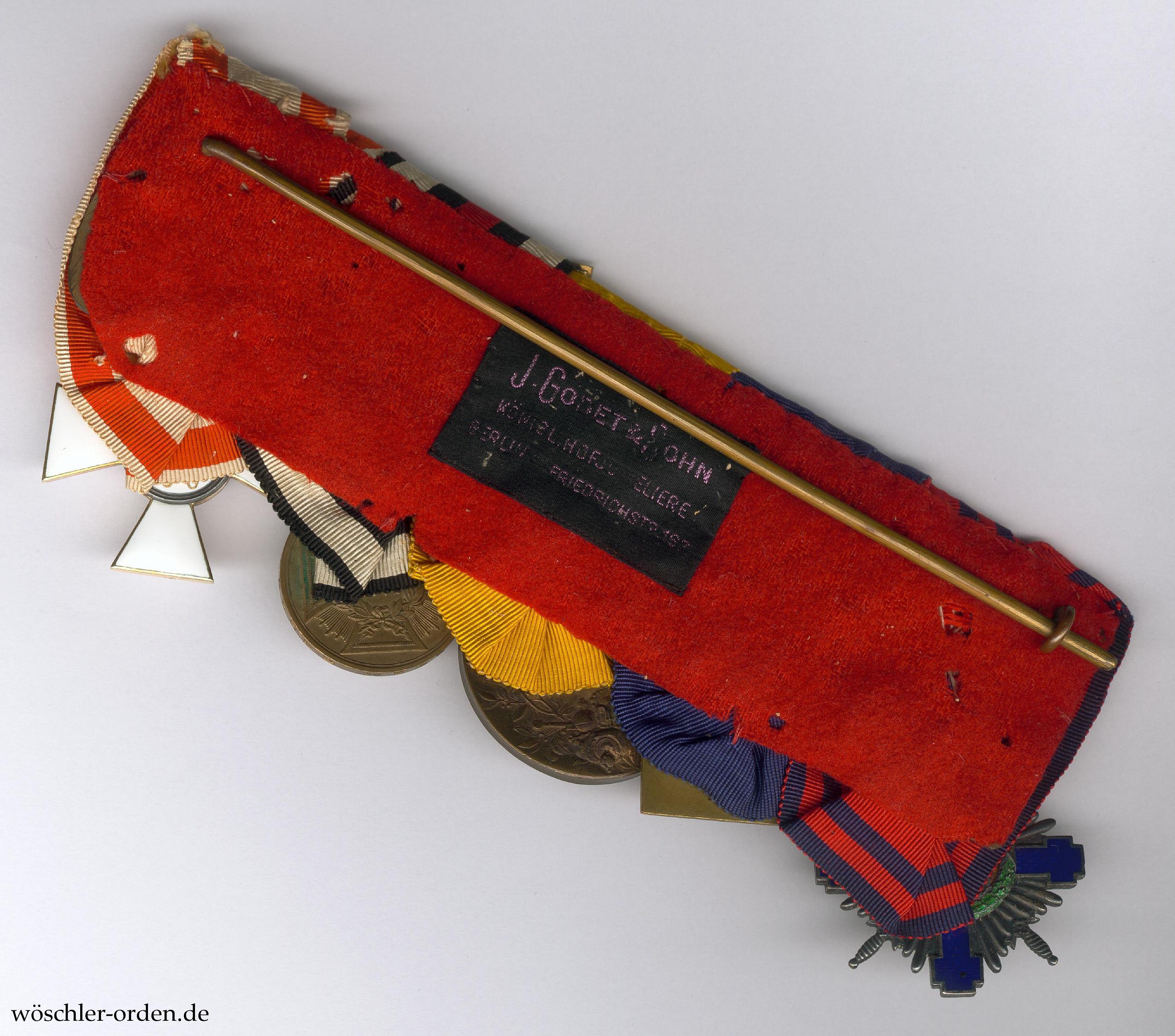 Frackschnalle mit bogenförmig vernähten Bändern aus Fertigung der Firma J. Godet & Sohn, Berlin, rückseitig mit roter Stoffabdeckung und entsprechendem Stoffetikett. Die Landwehr-Dienstauszeichnung in emaillierter Privatausführung, die übrigen Auszeichnungen verliehene Originalstücke, der Roter-Adler-Orden mit Ritzmarke „W“ der Hofjuweliere Joh. Wagner & Sohn, ebenfalls Berlin, am unteren Kreuzarm.
