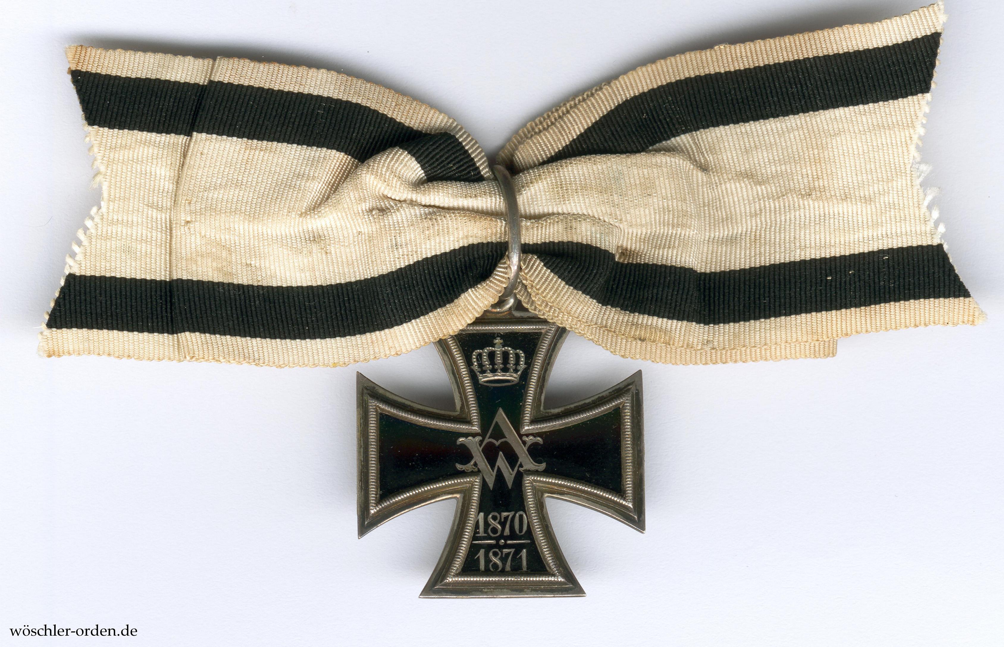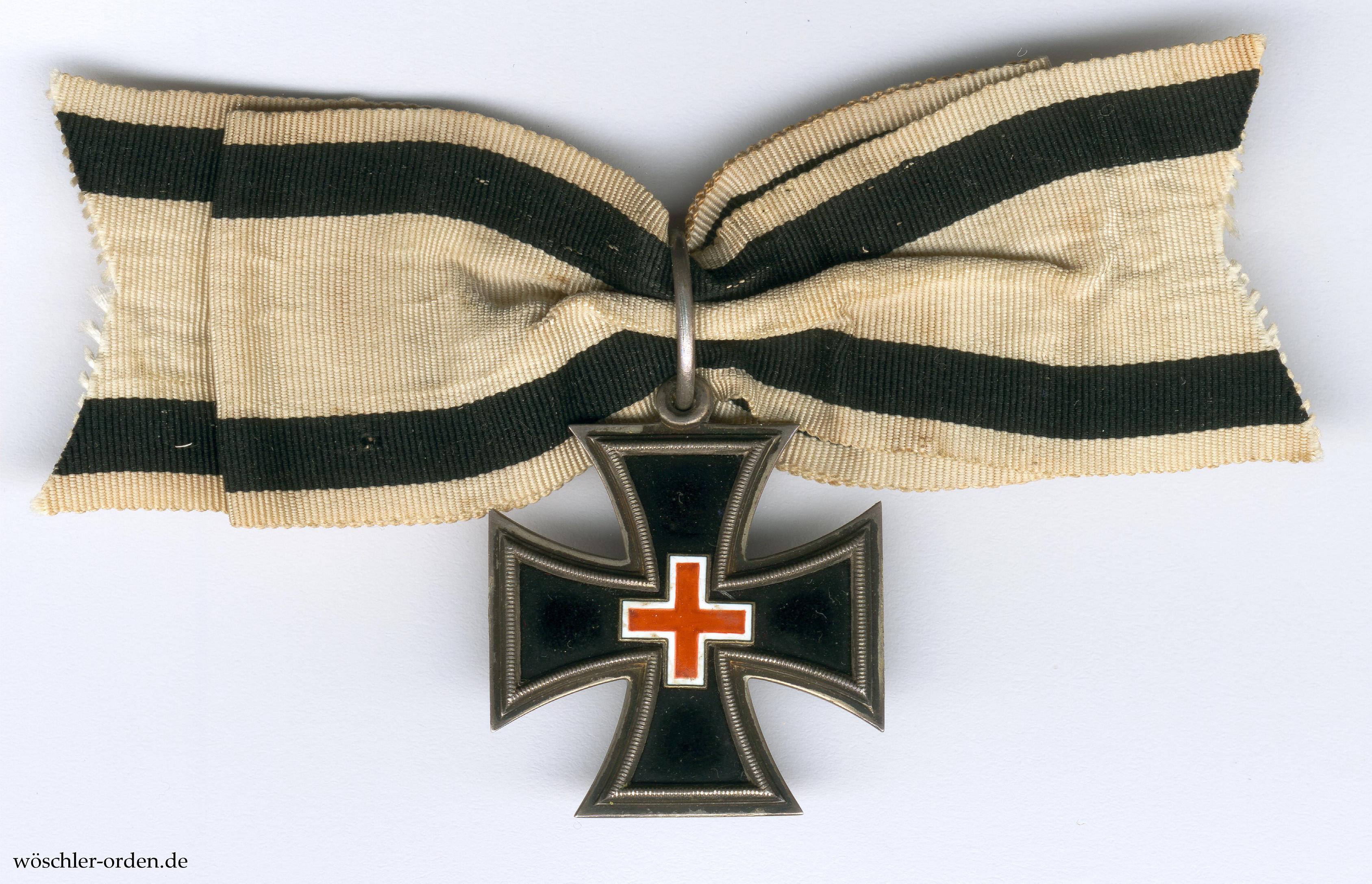 Der obere Kreuzarm vorderseitig mit großflächiger, oberflächlicher Abplatzung der Emaille sowie rückseitig mit einem winzigen Ausbruch. Hiervon abgesehen gute, leicht getragene Erhaltung, an originalem, zu einer Schleife geformten Bande.