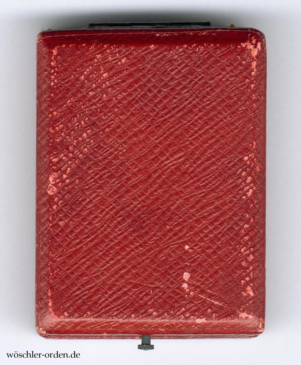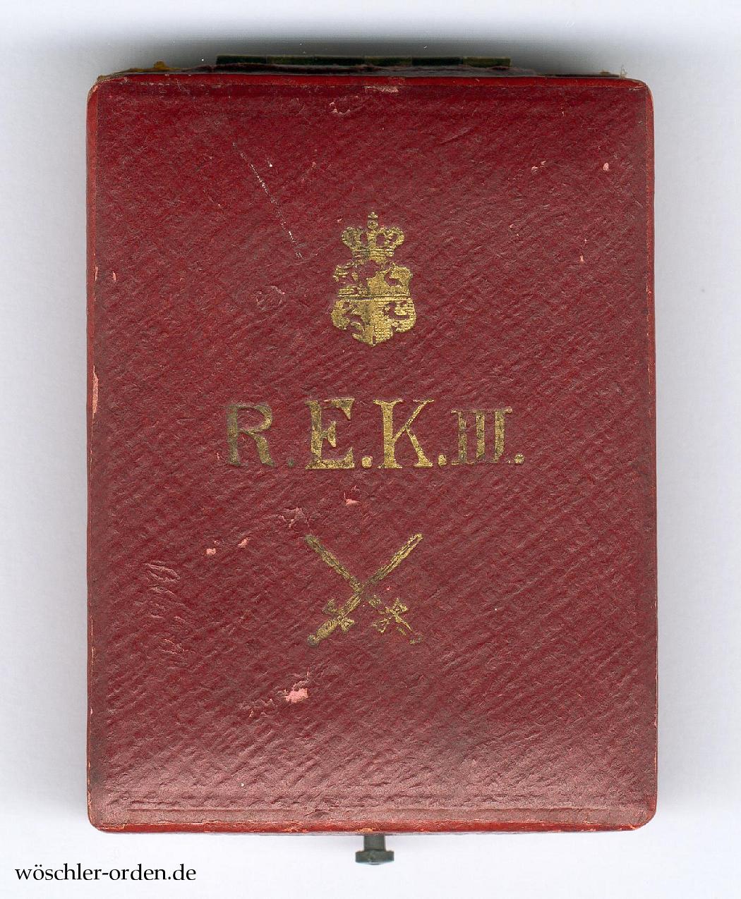 Dazu das rote Verleihungsetui mit golden aufgeprägtem Wappen, Zweckinschrift „R.E.K. III.“ sowie Schwertern, innen weißer Himmel sowie schwarze Einlage, keine Aussparung oder Halterung für ein Band.
