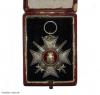Der Orden in guter, leicht getragener Erhaltung, eine Schwertklinge etwas verbogen, außerdem die Vergoldung etwas verblasst. Ohne Band. Das Etui etwas bestoßen und mit Alters- und Gebrauchsspuren, dies auch und vor allem innen.