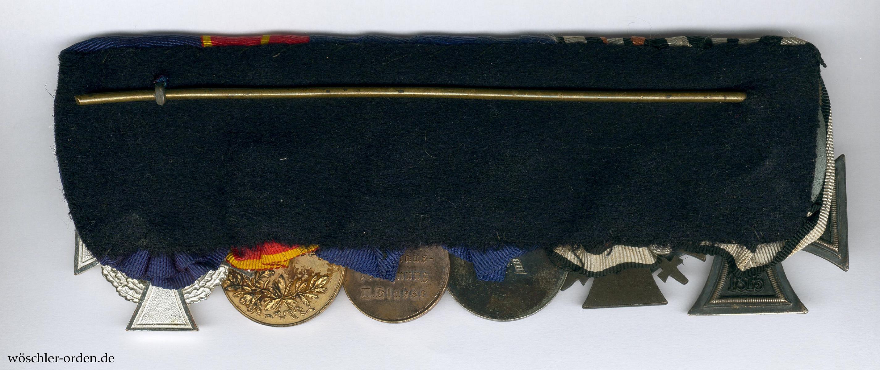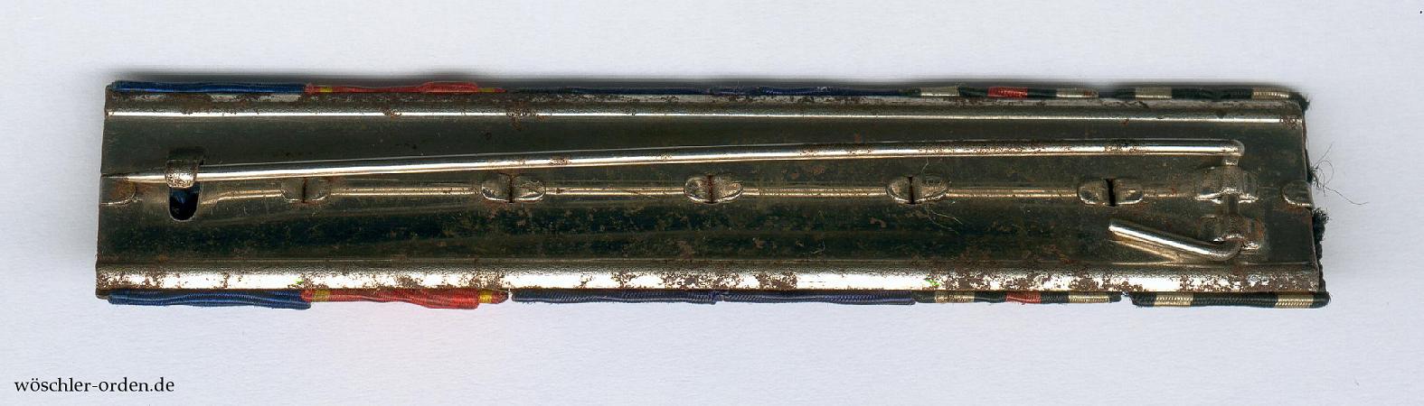 Bogenförmig vernähte Bänder, rückseitig schwarzes Abdeckung sowie Tragenadel. Abgesehen von der Medaille Für Eifer und wohl auch des Eisernen Kreuzes handelt es sich um verliehene Originale. Gute, getragene Erhaltung.