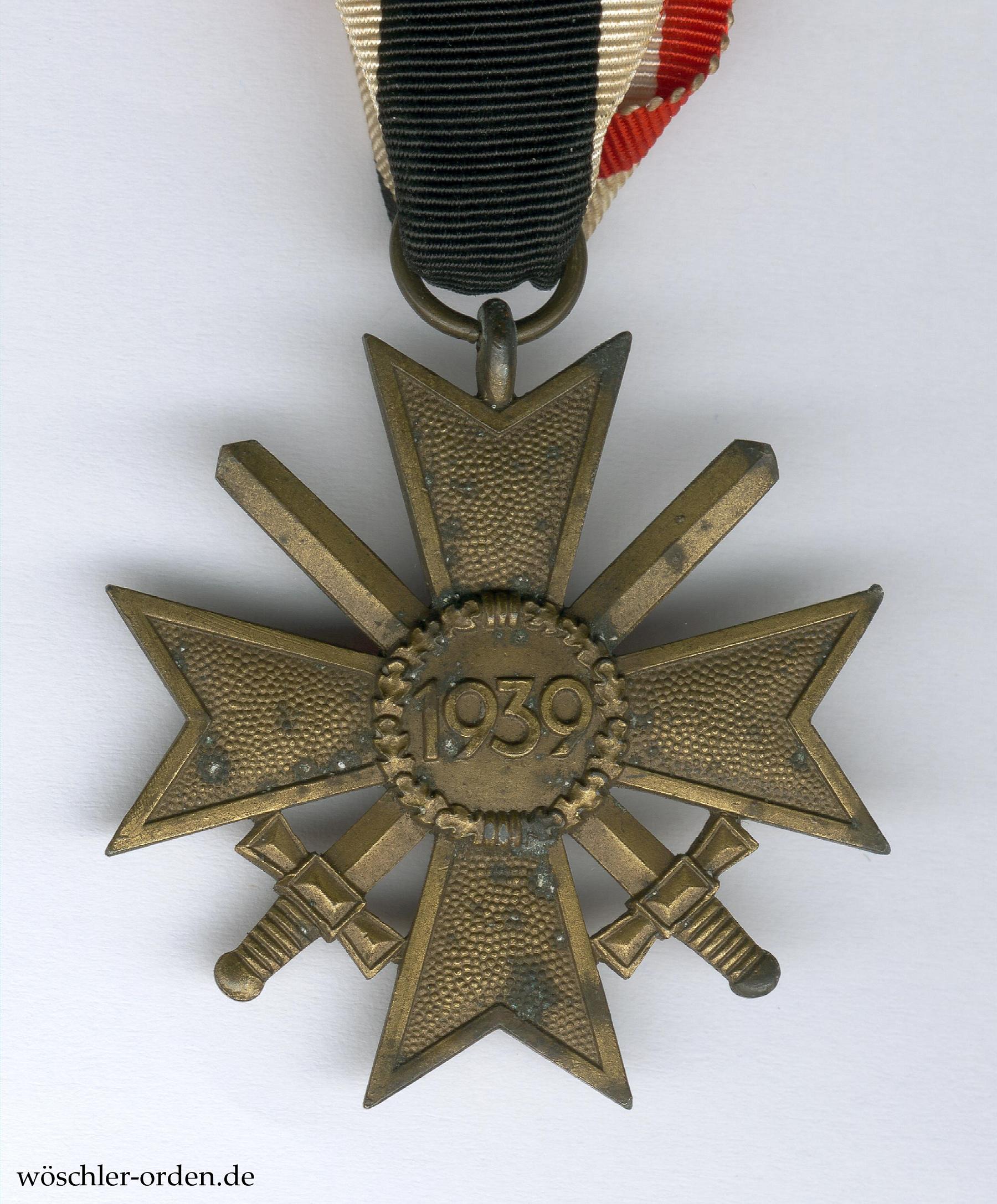 Dazu weiters ein Kriegsverdienstkreuz 1939 II. Klasse mit Schwertern mutmaßlich desselben Trägers, in bronziertem Kriegsmetall, mit Herstellerpunze „110“ der Firma Otto Zappe, Gablonz, im Bandring. Stellenweise fleckig, an getragenem Band.