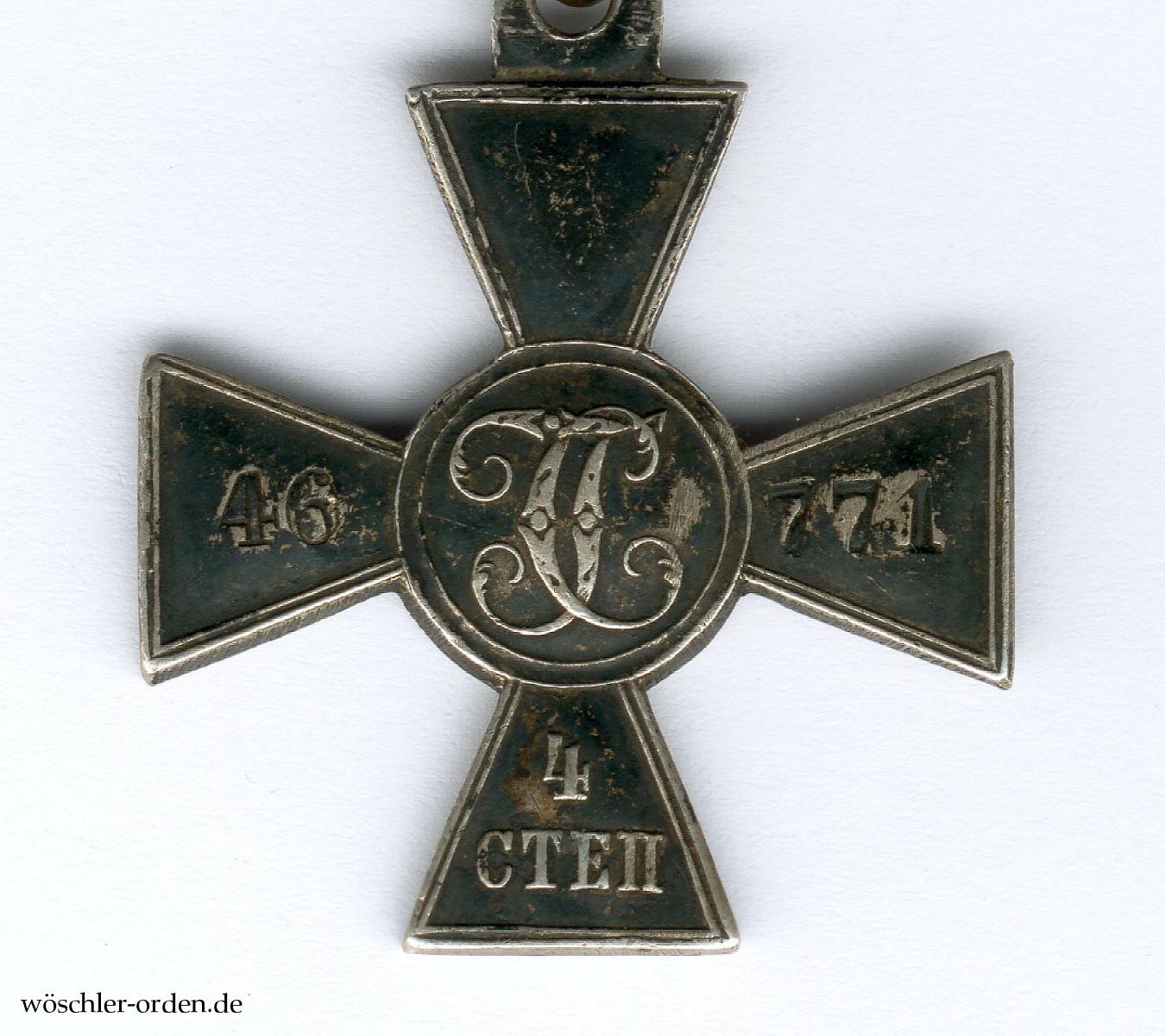 Exemplar aus dem Russisch-Türkischen Krieg von 1877/78. Silber, einteilig geprägt, an mitgeprägter, gelochter Öse in der für die Stücke dieser Periode typischen Form. Auf den rückseitigen Kreuzarmen gravierte Matrikelnummer „46 / 771“.
