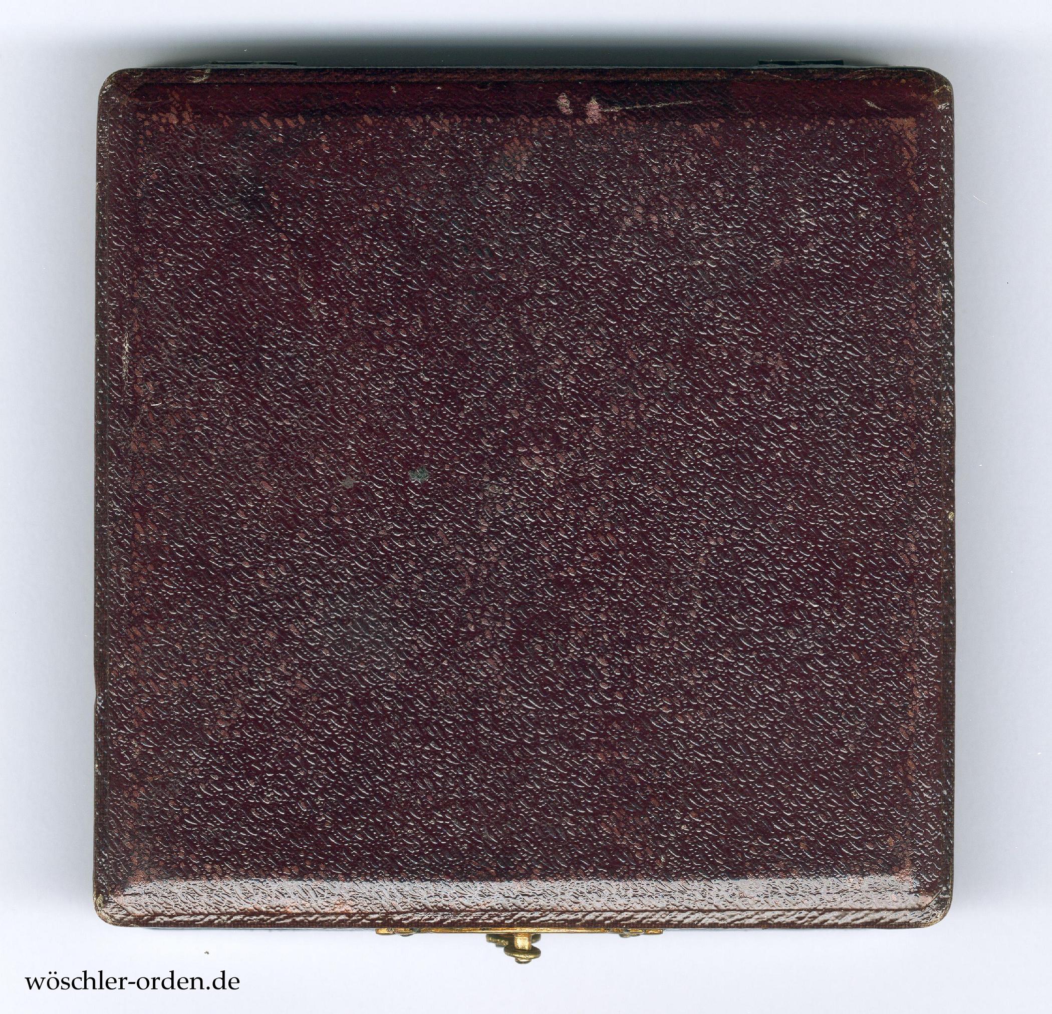 Der Orden mit einem Riss in der weißen Emaille des Medaillons, ansonsten in guter, nur wenig getragene Erhaltung, lediglich stellenweise etwas fleckig. Das Etui ebenfalls in guter Erhaltung, allerdings nachträglich mit einem Klarlack überzogen, weswegen es nicht matt ist, sondern glänzt.